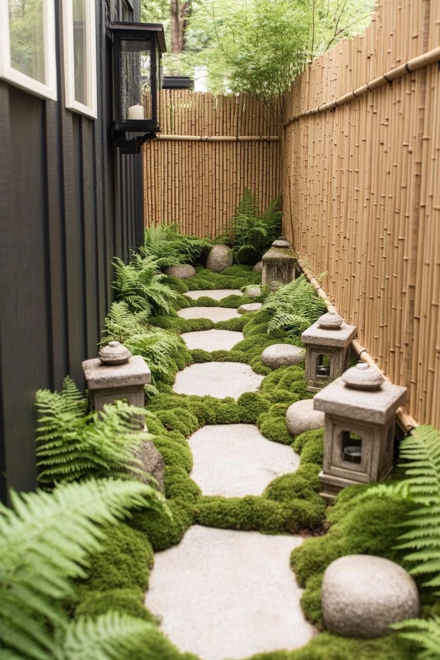 To achieve a similar look, I recommend incorporating stepping stones surrounded by soft moss and ferns. Adding lanterns can enhance the serene vibe, inviting calmness to any space.