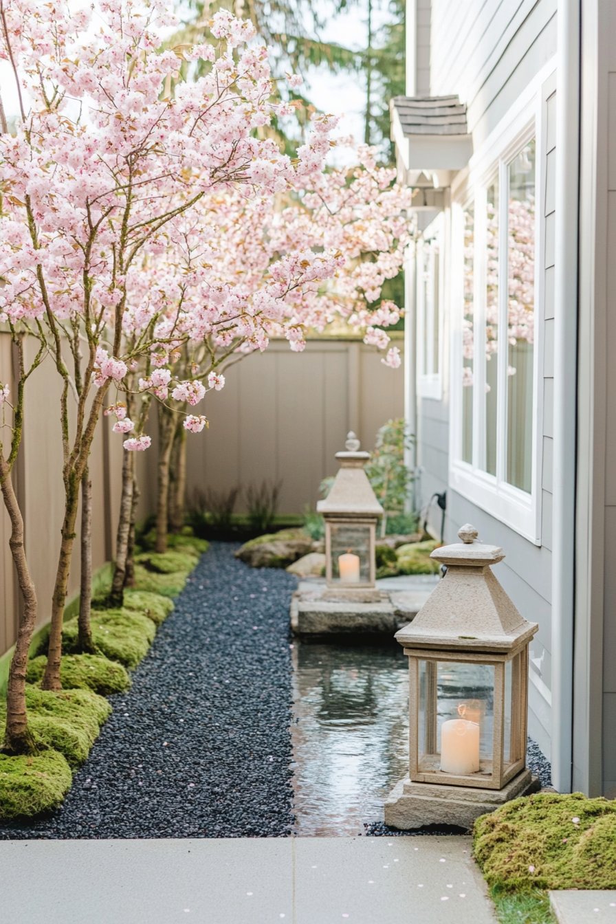To achieve a similar look, I recommend planting flowering trees along a pathway lined with dark gravel. Incorporate lanterns and natural stone accents to enhance the serene atmosphere.