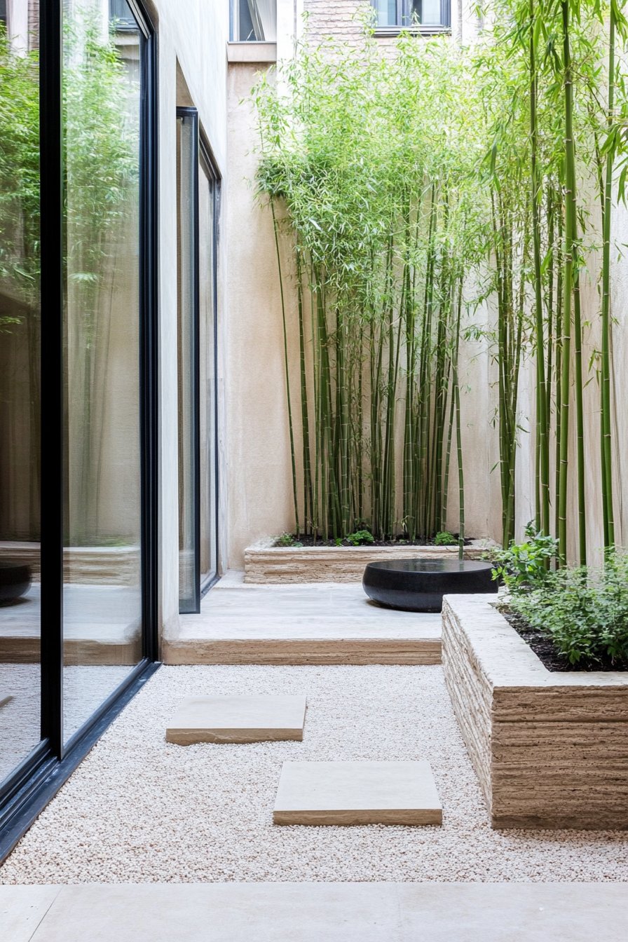 To achieve a similar look, I recommend incorporating vertical plantings like bamboo for height and privacy. Pair them with natural stone elements and gravel for a serene, modern feel.