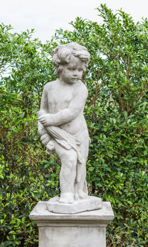 This cherub-like figure, resting on a stone pedestal, brings innocence and tradition to the space. The symmetry of the statue pairs well with neatly clipped hedging and formal layouts. Its faded finish gives it a timeless, antiqued look that improves with age and invites pairing with other symmetrical features like urns, topiaries, or fountains.