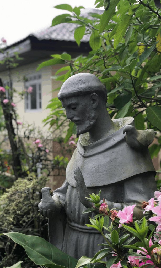 This statue of St. Francis of Assisi, gently cradling birds, brings a deep sense of peace and reflection to the garden. The stone texture, slightly weathered patina, and downward gaze evoke spirituality and stillness.