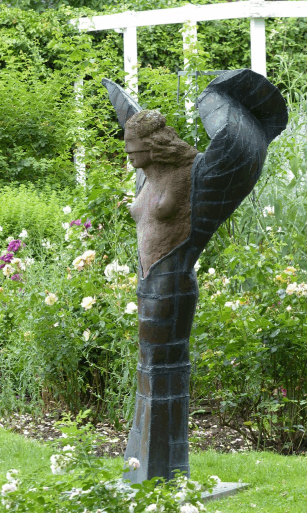 A bold piece that fuses classical form with contemporary sculptural abstraction. The wing-like extensions add both grandeur and delicacy, while the contrast between smooth and textured surfaces gives it striking depth. Ideal in a flower-heavy border or as a central feature in a rose garden.