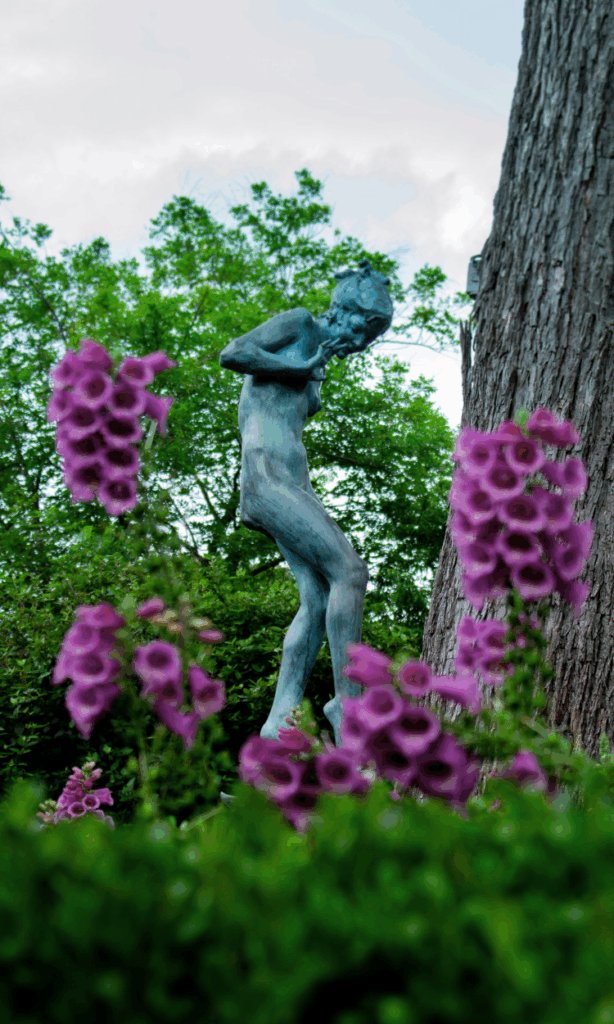 This elongated bronze figure captures motion and vulnerability in a single pose—knees bent, arms clenched, almost mid-thought. Surrounded by foxgloves and mature trees, it contrasts natural exuberance with human stillness.