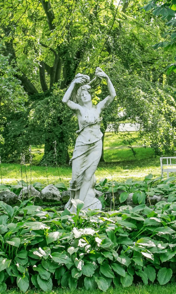 This kind of sculpture thrives in formal gardens or woodland glades, especially when framed by lush, green foliage that softens her pale stone finish.