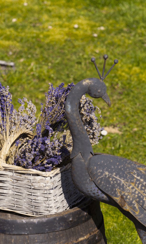 Crafted in distressed metal, this stylized peacock brings rustic charm to the garden. Its handmade, folk-art style contrasts delightfully with the lavender-filled basket, bridging natural softness with manmade whimsy.