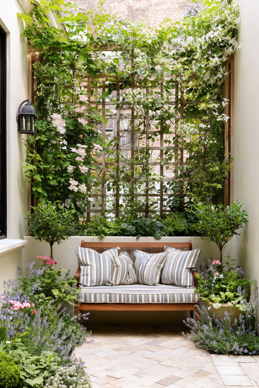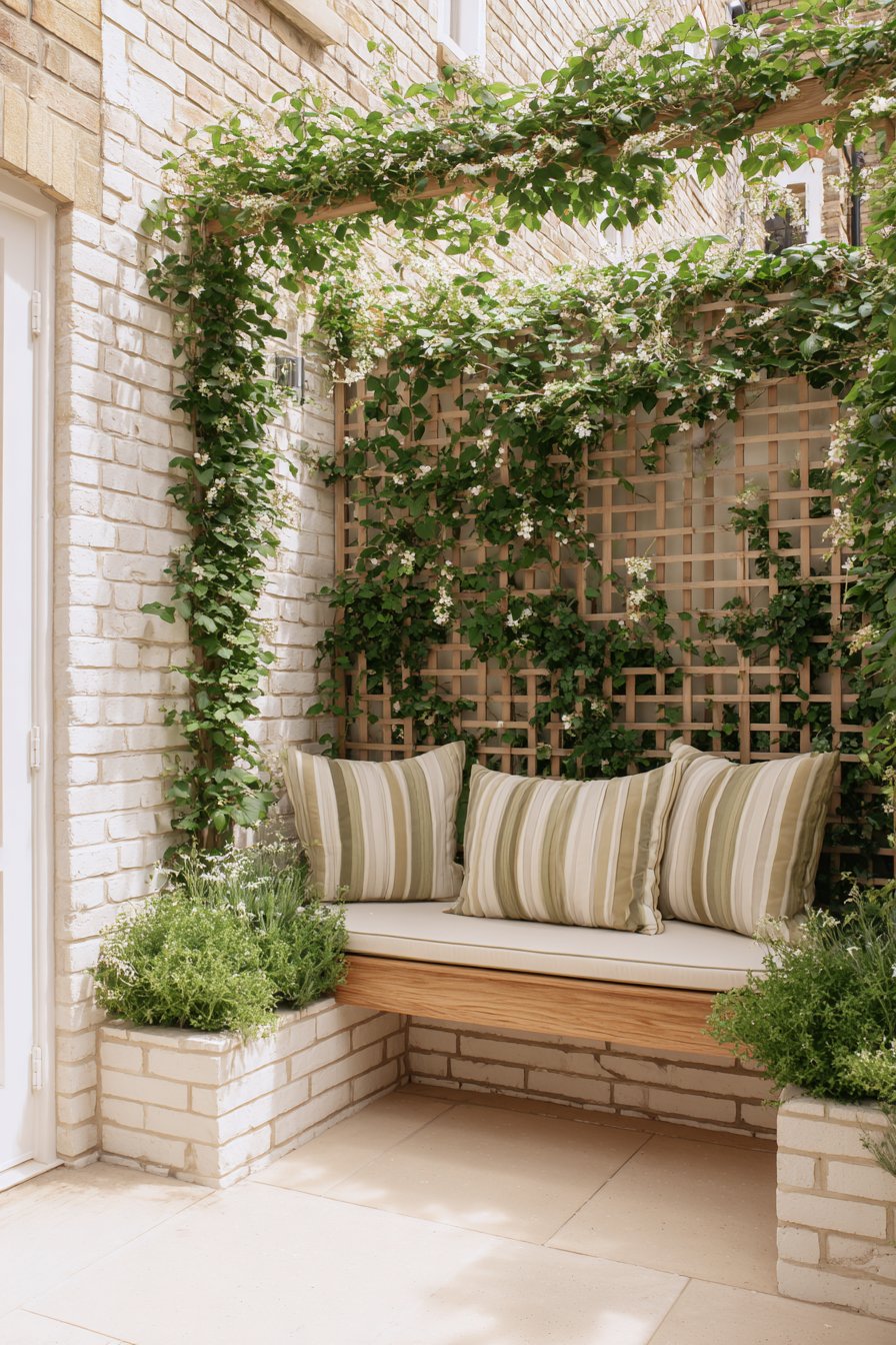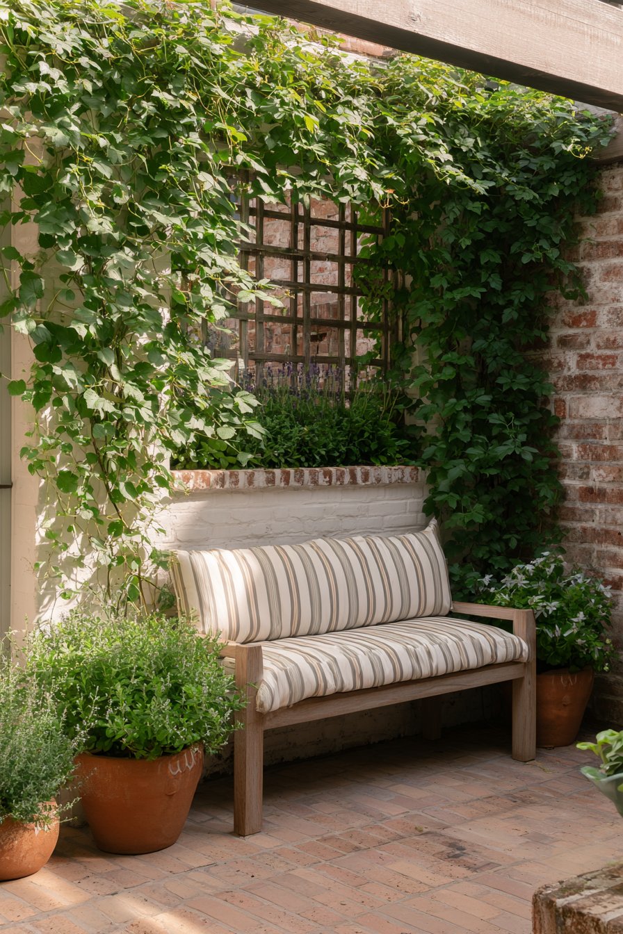 This cozy patio garden features lush greenery cascading over a rustic trellis, blending natural textures with inviting seating for a serene retreat. To achieve a similar atmosphere, incorporate warm brick tones and potted herbs alongside comfortable, striped cushions for a touch of style.