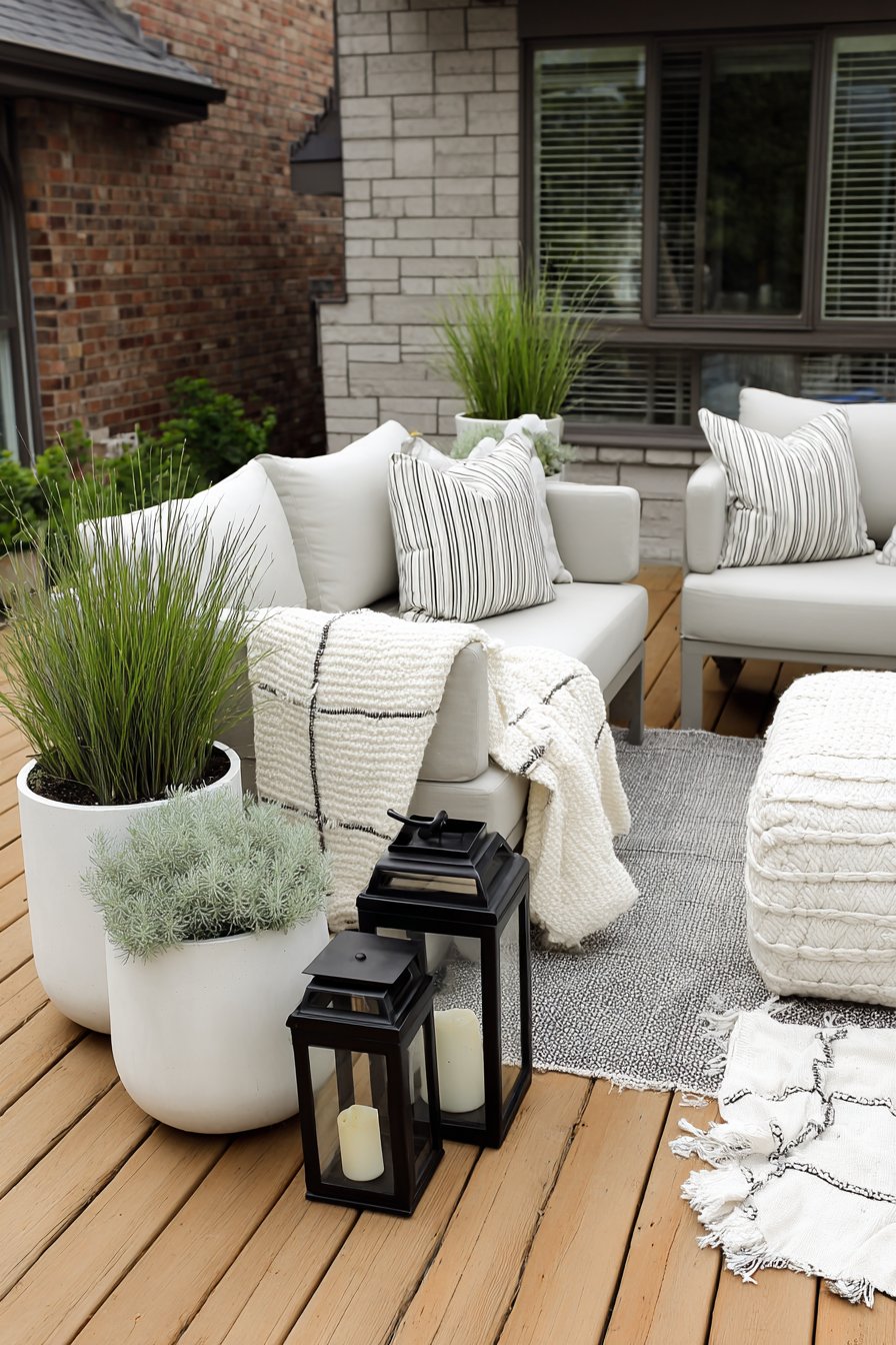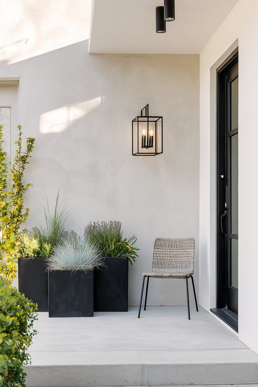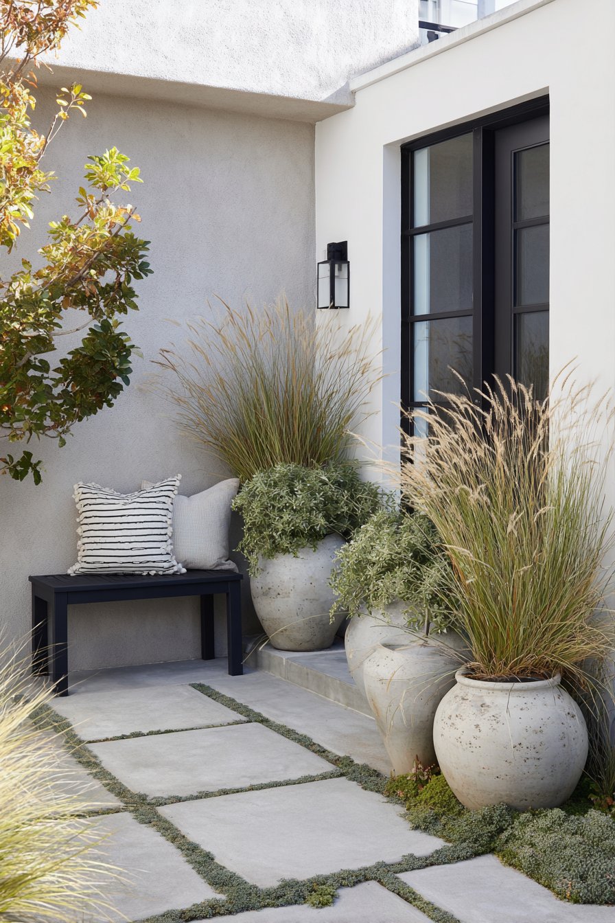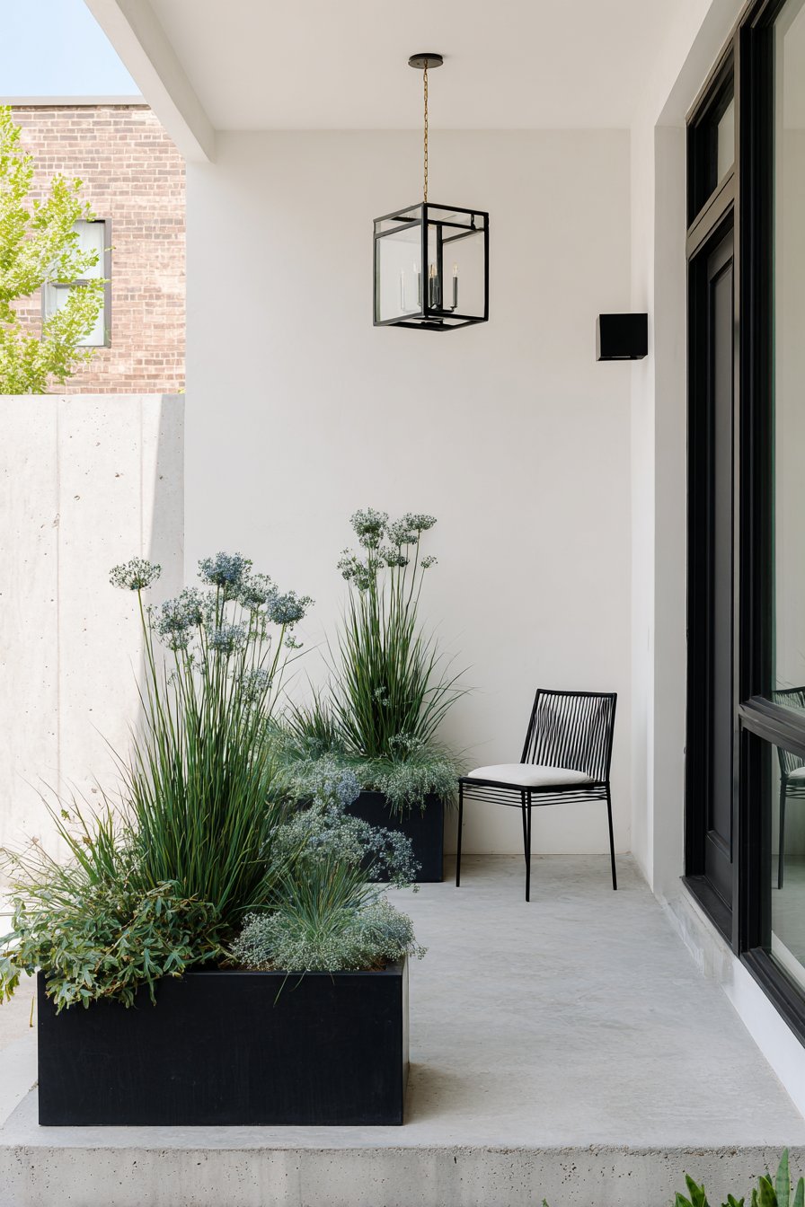 The sleek, minimalist design of the patio features bold black planters filled with a lush mix of grasses and herbs, creating a serene, modern atmosphere. To achieve this look, incorporate clean lines in your furniture and use a monochromatic color palette to enhance the tranquil vibe.