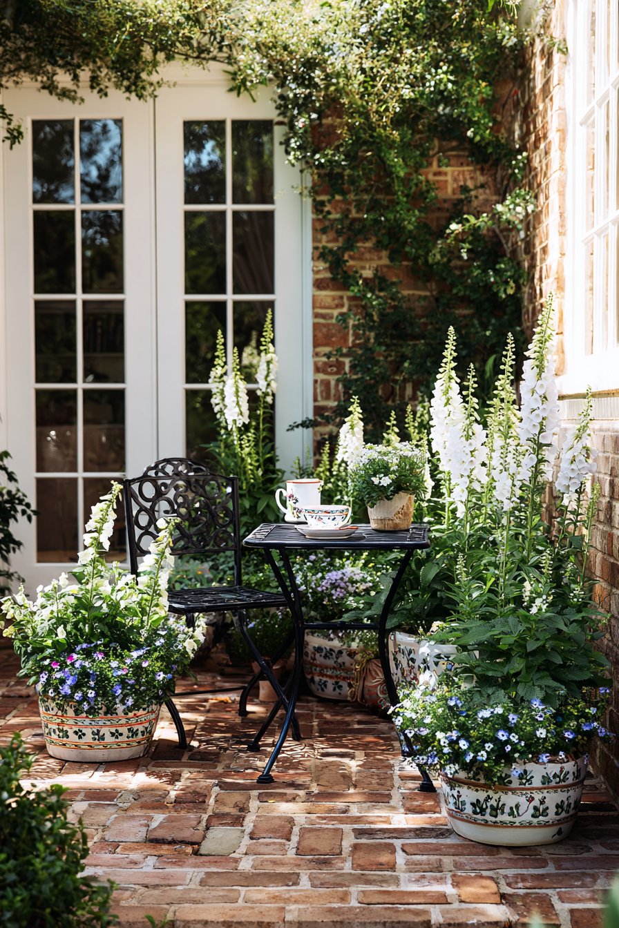 This charming patio beautifully combines soft white foxgloves and vibrant blue flowers, creating a serene and inviting atmosphere perfect for relaxation. To emulate this look, use patterned pots to add texture and consider a small bistro table for a cozy dining spot.