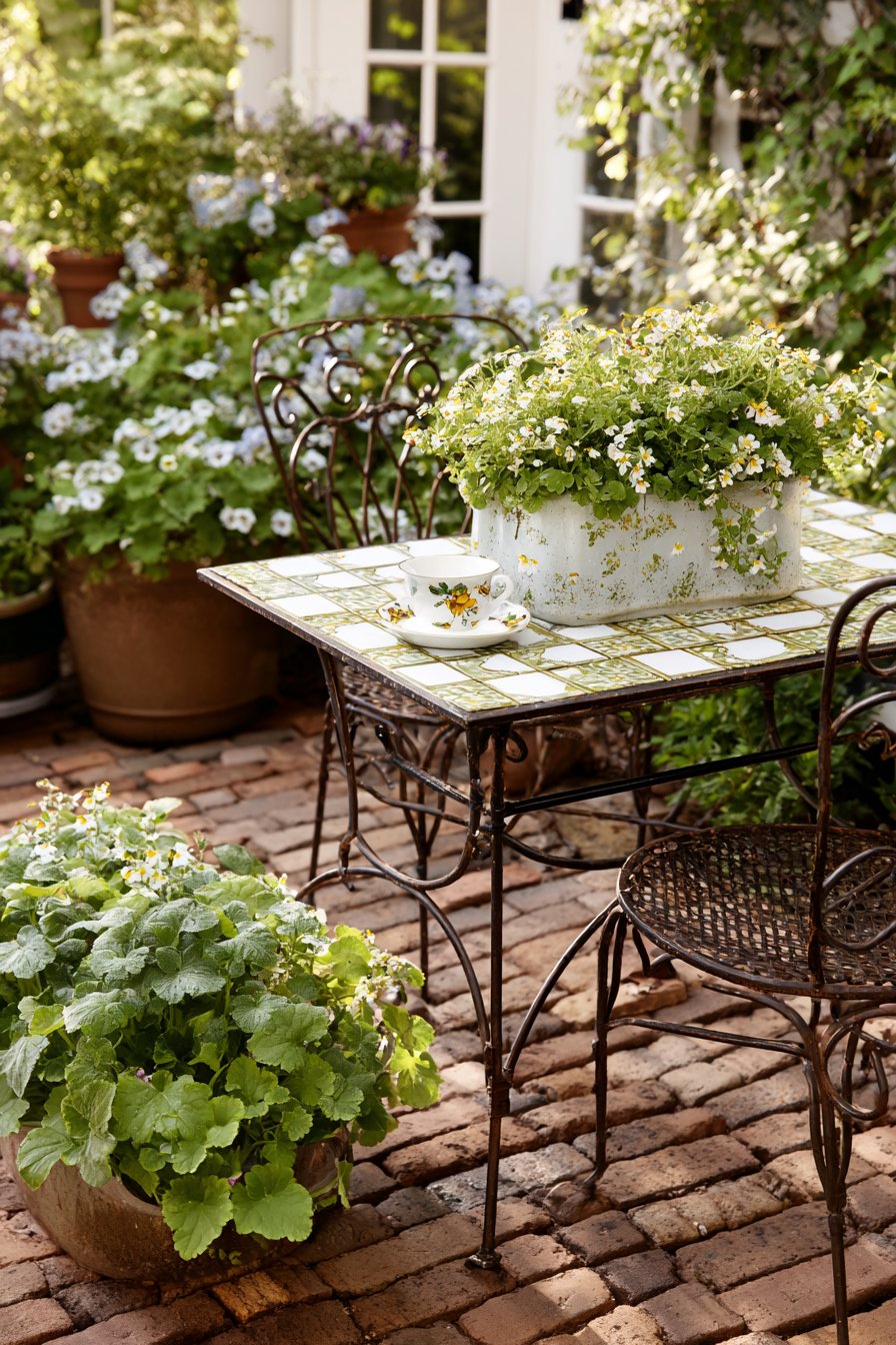 This inviting small patio garden beautifully combines lush greenery with delicate floral accents, creating a serene and cozy atmosphere ideal for relaxation. To achieve this look, incorporate a mix of terracotta pots, vintage furniture, and vibrant plants like pansies and creeping Jenny for a charming touch.