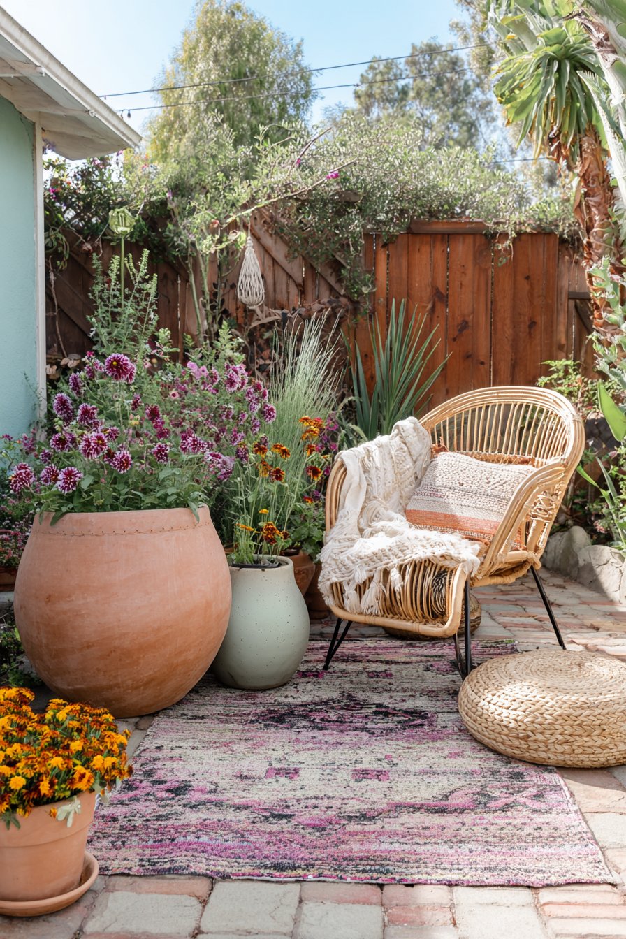 This cozy patio garden embraces a bohemian style with earthy terracotta pots, vibrant flowers, and textured textiles, creating an inviting retreat. To achieve this look, incorporate layered plants for depth and mix materials like woven chairs and patterned rugs for a warm, eclectic vibe.