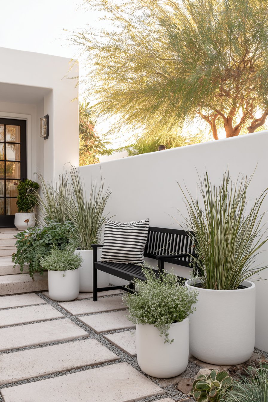 This contemporary minimalist patio garden features a harmonious blend of clean lines and lush greenery, creating a serene retreat with a touch of elegance. Incorporate white planters, textured grasses, and inviting seating to achieve a similar tranquil atmosphere in your outdoor space.