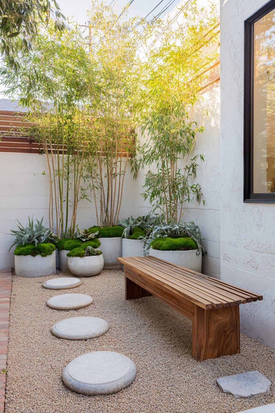 This serene patio design showcases a harmonious blend of textures with bamboo planters, smooth pebbles, and a wooden bench, creating a tranquil retreat. To achieve this look, incorporate soft greens like moss and succulents, complemented by tall bamboo for vertical interest.