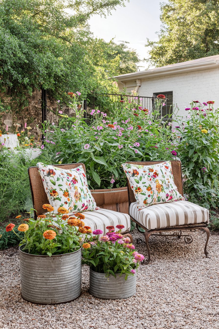 This cozy patio features vibrant zinnias and soft, lush greenery, creating a warm, inviting atmosphere perfect for relaxation. Incorporate vintage-style seating and textured pillows to enhance comfort and charm.