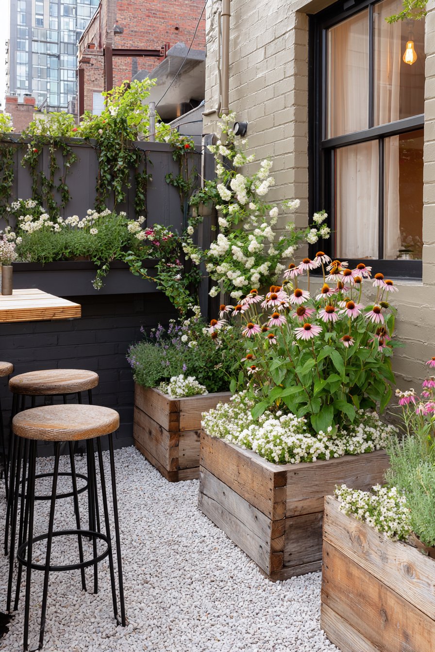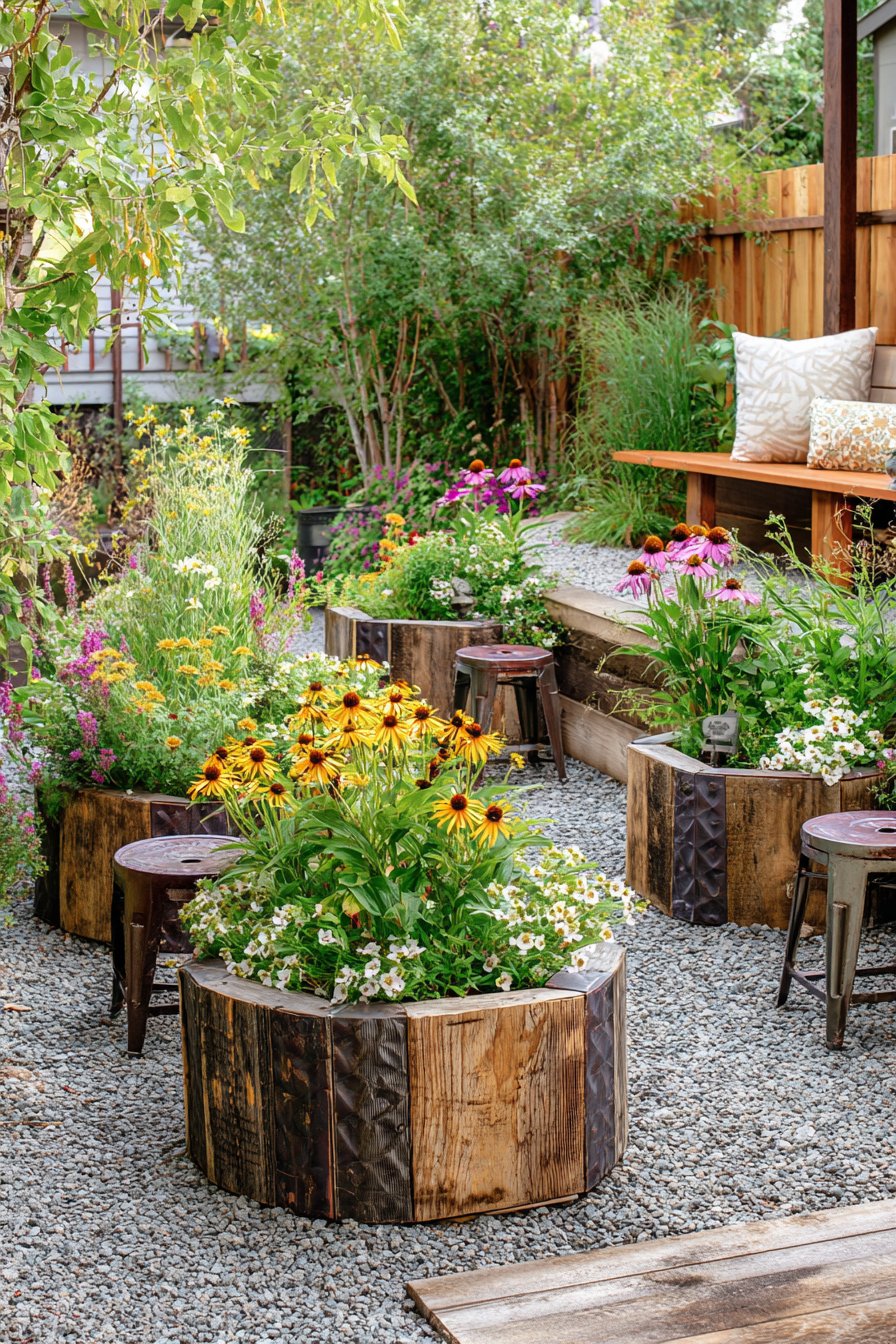 Vibrant flower planters in rustic wooden containers create a charming, inviting atmosphere, while the gravel path adds texture and warmth to the small patio garden. Incorporate comfortable seating and colorful blooms for a cozy retreat that encourages relaxation and connection with nature.