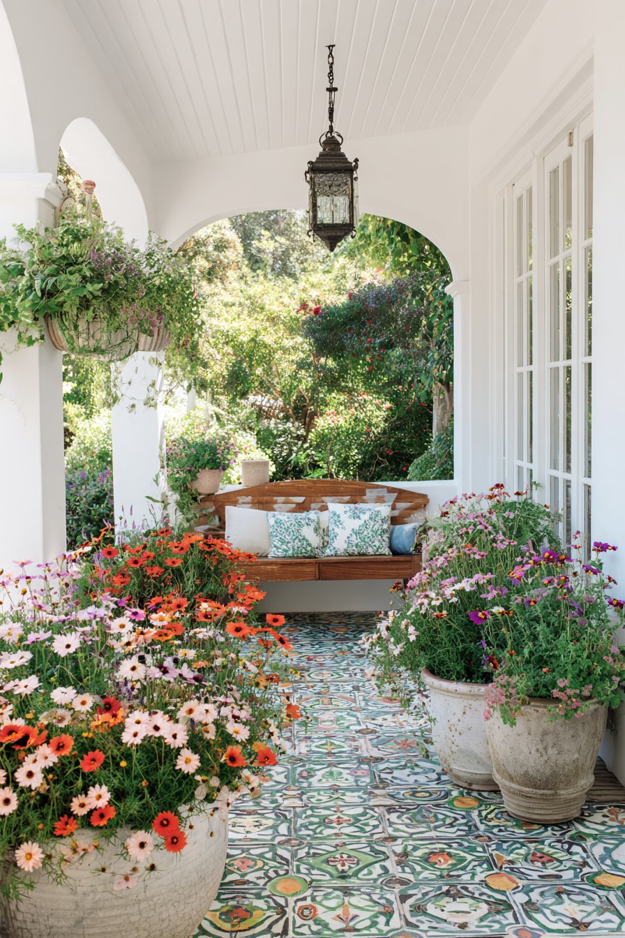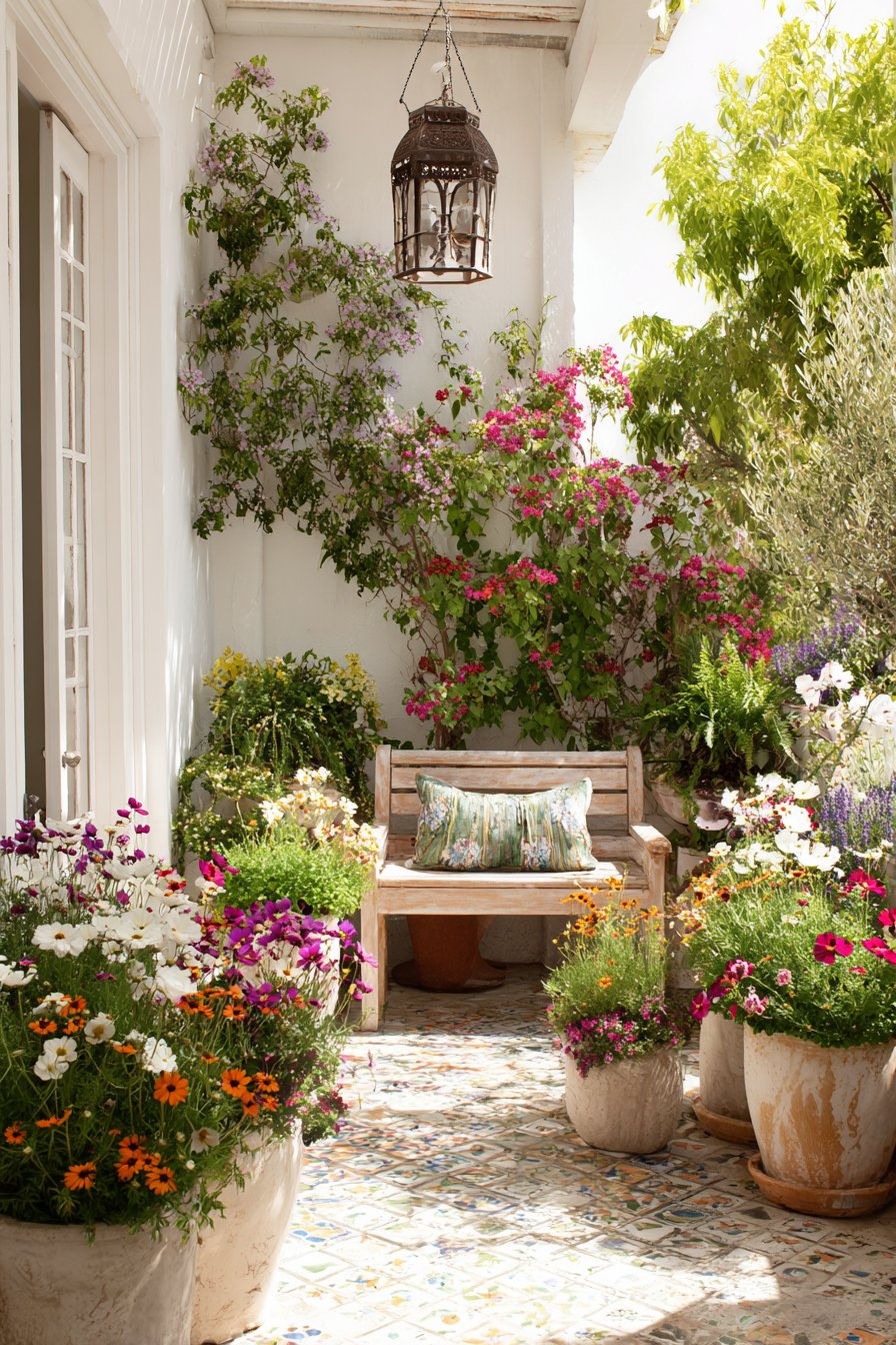 Vibrant blooms in terracotta pots create a cheerful atmosphere, while the rustic wooden seating invites relaxation amidst a tapestry of colors and textures. Incorporate patterned tiles for visual interest and choose a mix of perennials for year-round beauty.