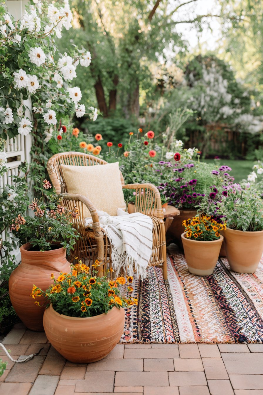 This cozy patio blends vibrant blooms with earthy textures, featuring a rattan chair that invites relaxation amid a riot of colorful florals. To achieve this look, incorporate layered plantings, varied heights, and a patterned rug for added warmth and visual interest.