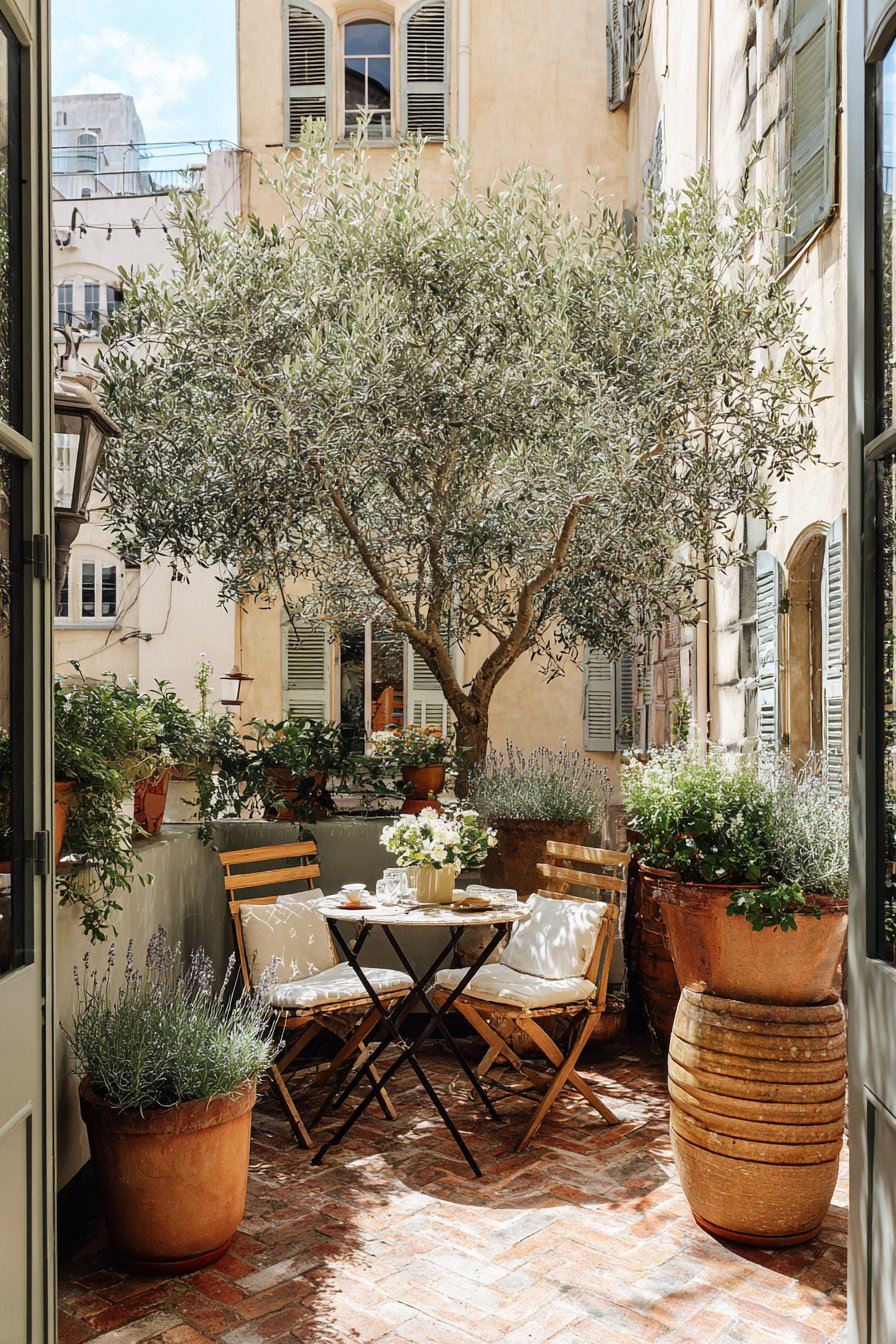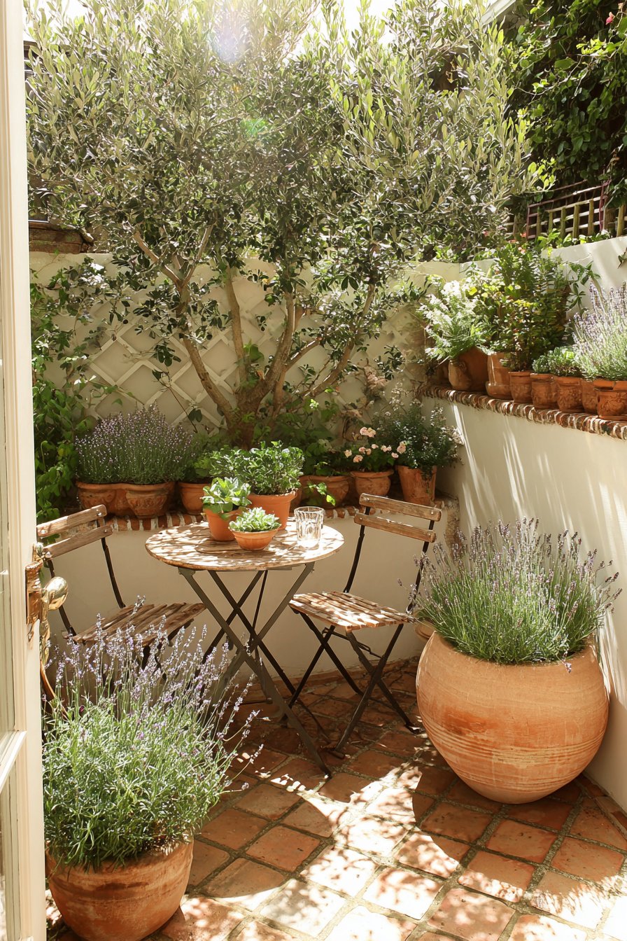 This charming patio retreat features the soothing greens of an olive tree and the delicate purples of lavender, creating a serene atmosphere for relaxation. Incorporate rustic terracotta pots and a cozy bistro table to evoke a Mediterranean feel in your own garden space.