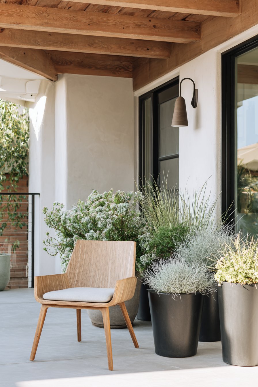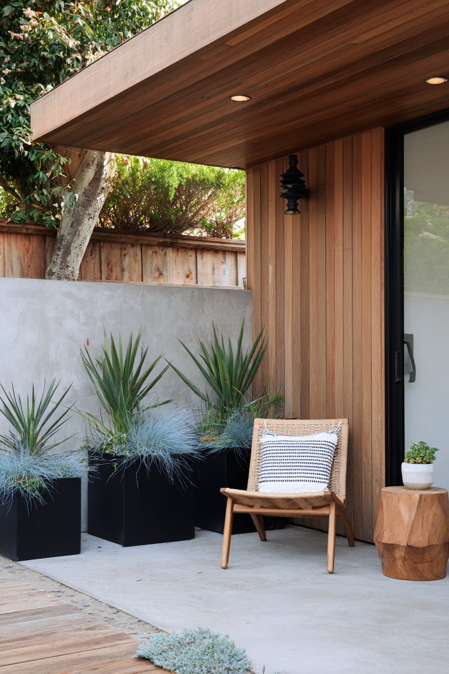 The sleek lines and muted color palette create a serene atmosphere, enhanced by the lush greenery spilling from modern planters. Incorporate minimalist furniture and diverse textures to achieve a cohesive, tranquil outdoor space.