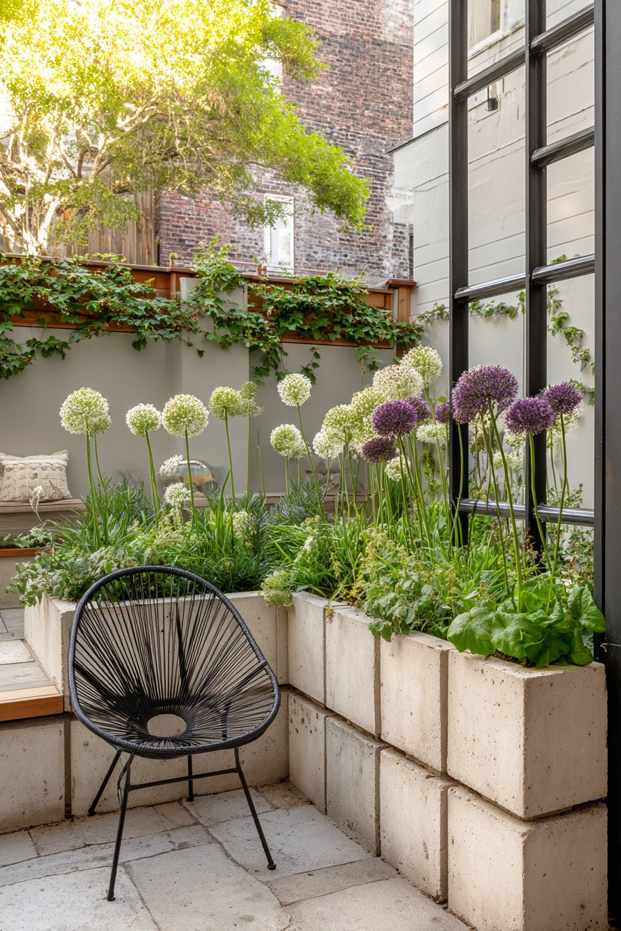 This modern small patio garden seamlessly combines sleek concrete planters with lush green textures and vibrant alliums, creating a refreshing urban oasis. To achieve a similar aesthetic, incorporate varied heights and colors in your planting, using a mix of ornamental grasses and striking bulb flowers for visual interest.