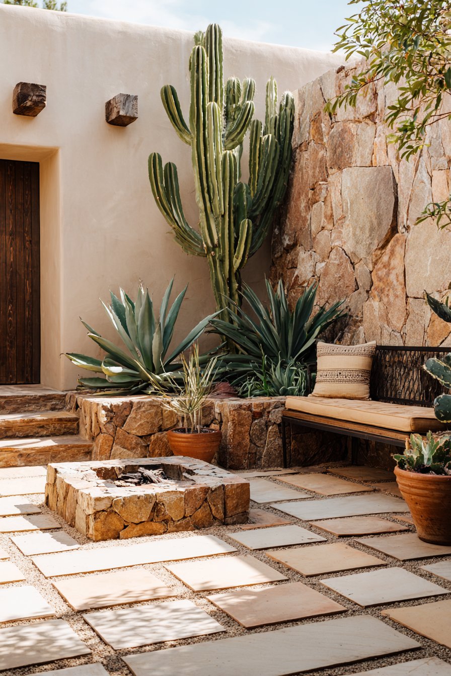 The warm tones of the stone patio, combined with lush succulents and cacti, create a serene retreat that invites relaxation and reflection. Incorporate natural materials and earthy colors, along with comfortable seating, to evoke a tranquil outdoor space reminiscent of a desert oasis.