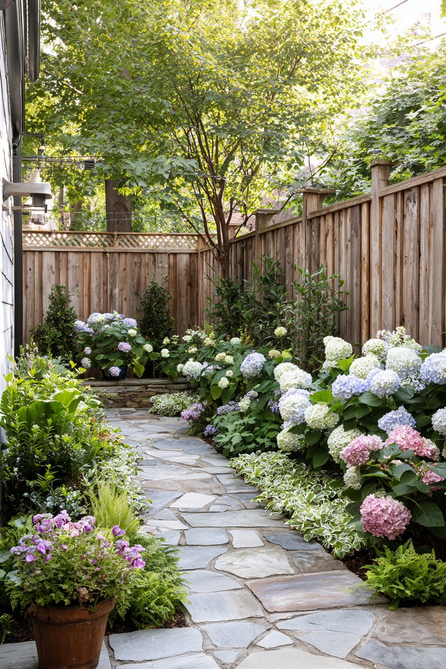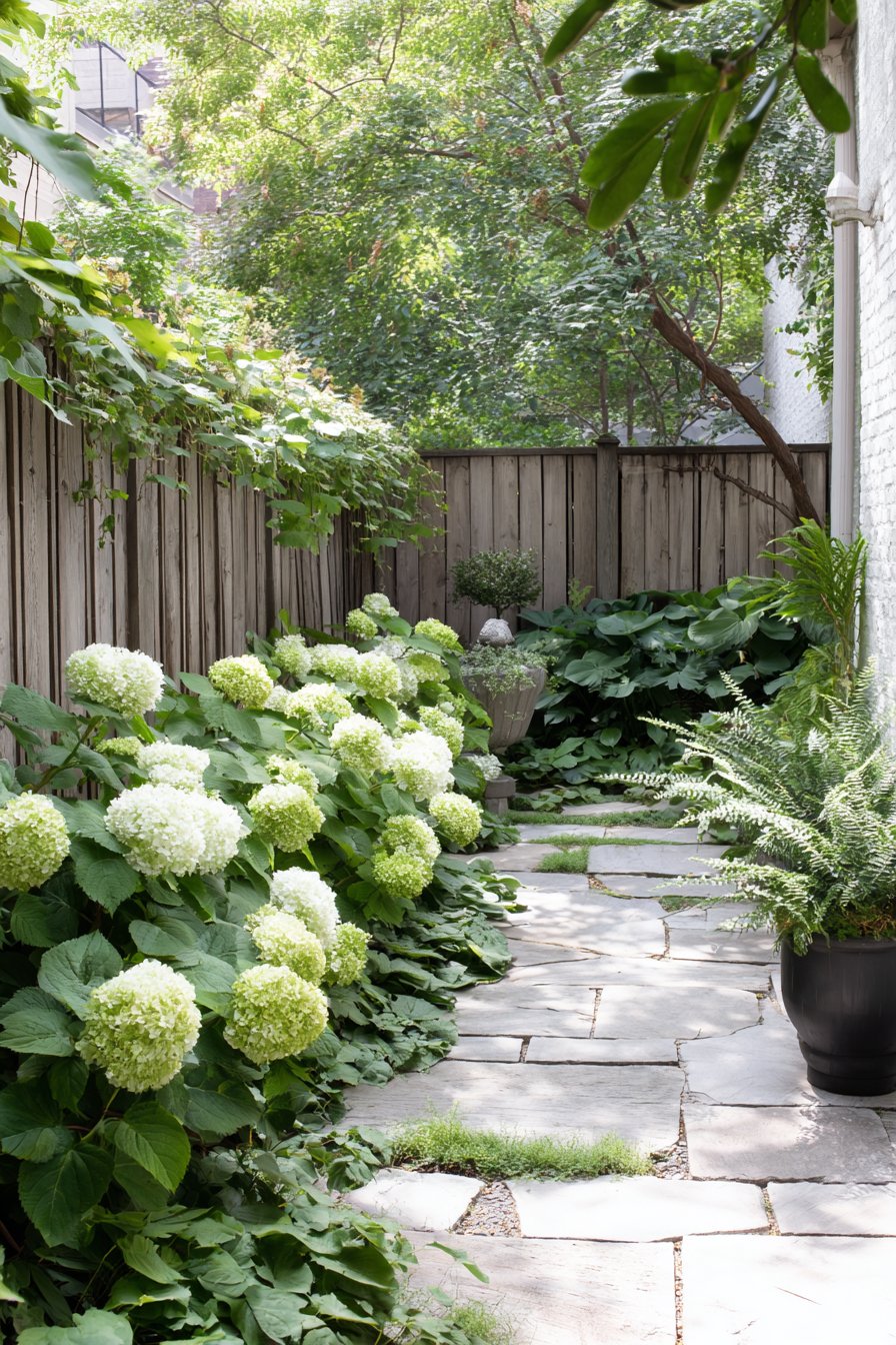 This small patio garden exudes tranquility with its lush hydrangeas and natural stone pathway, creating a serene retreat. Incorporate varied textures and greenery to enhance depth, while selecting furniture that complements the soft color palette for a cohesive look.