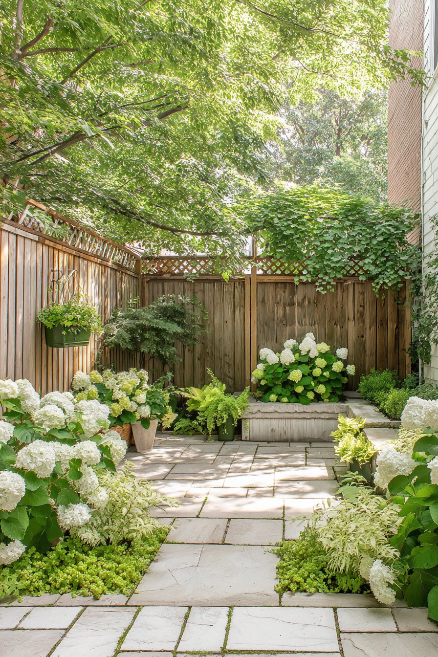 This intimate patio garden showcases lush white hydrangeas against a backdrop of vibrant greenery, creating a serene and inviting atmosphere. To achieve a similar look, incorporate a mix of textures with stone pavers and various foliage, ensuring a balance of light and shade.