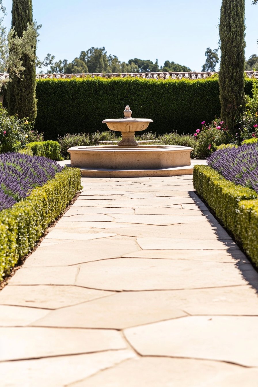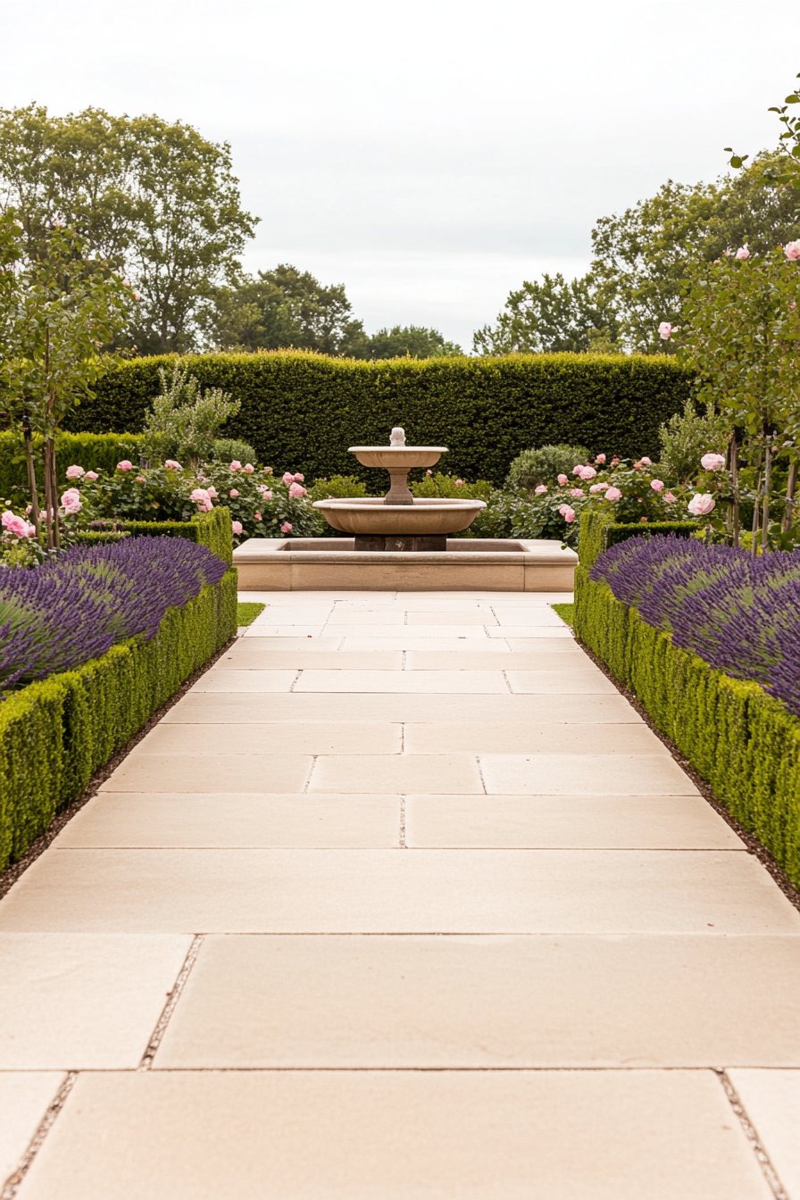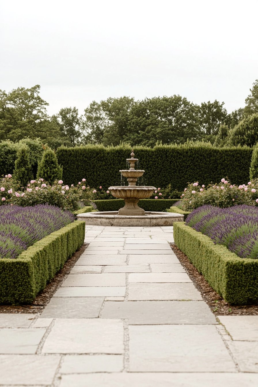 This garden design features a stunning stone pathway bordered by lush lavender and neat boxwood hedges, leading to a classic fountain. The soft pink roses add a romantic touch, creating a serene and inviting atmosphere.