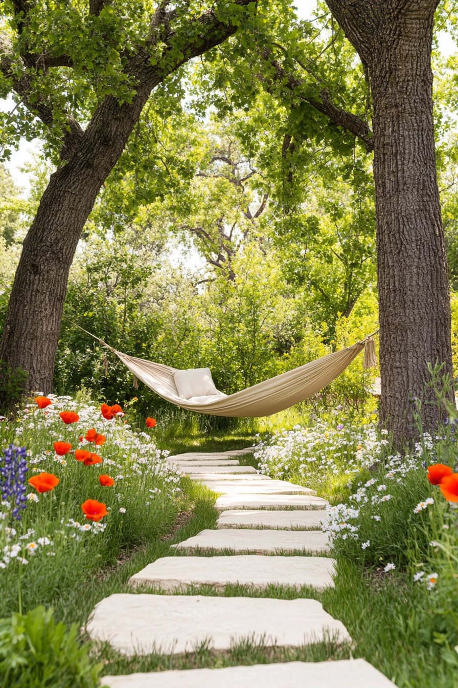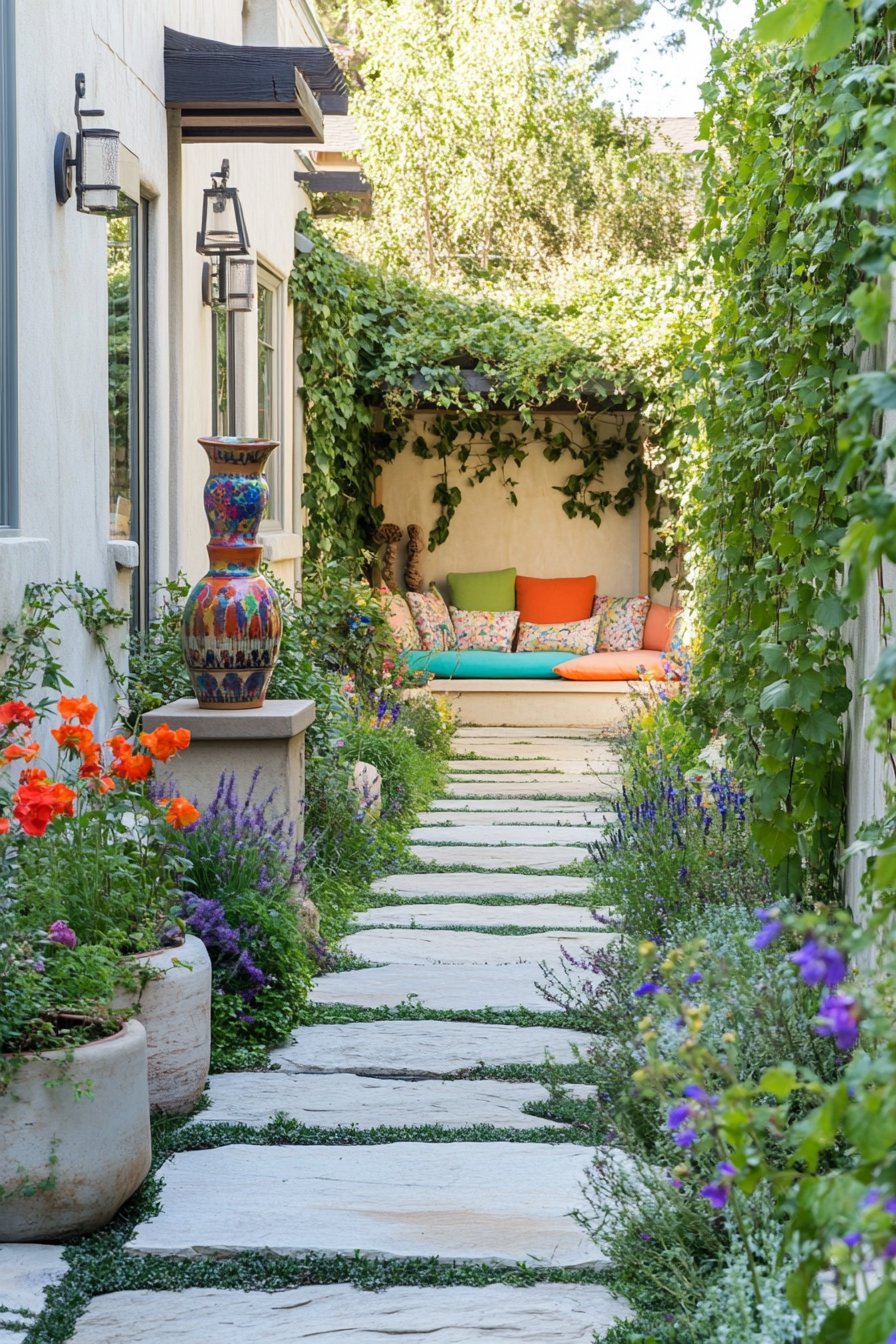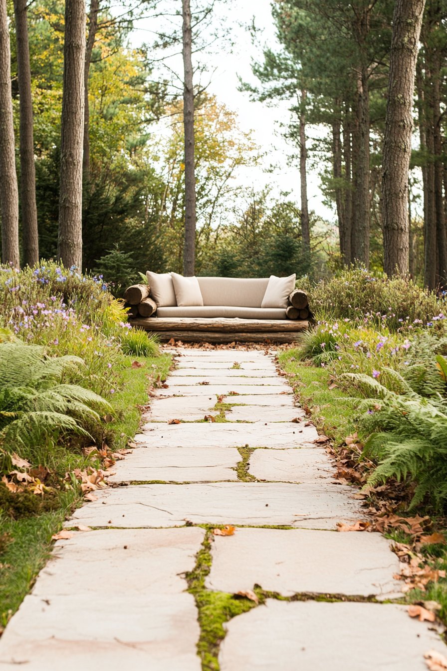 This design beautifully combines natural elements with comfortable seating, creating a peaceful sanctuary. To achieve a similar look, incorporate a rustic seating area made from natural materials and line the path with large stone slabs, surrounded by lush greenery and colorful blooms.