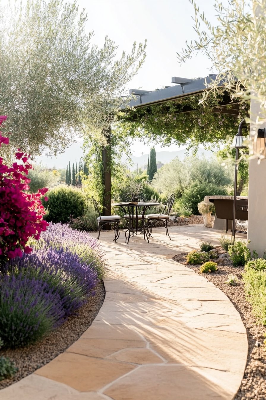 This design beautifully blends vibrant colors with natural textures, featuring lush bougainvillea and fragrant lavender. To achieve a similar look, incorporate curved pathways with natural stone and select a mix of flowering plants that thrive in your climate.