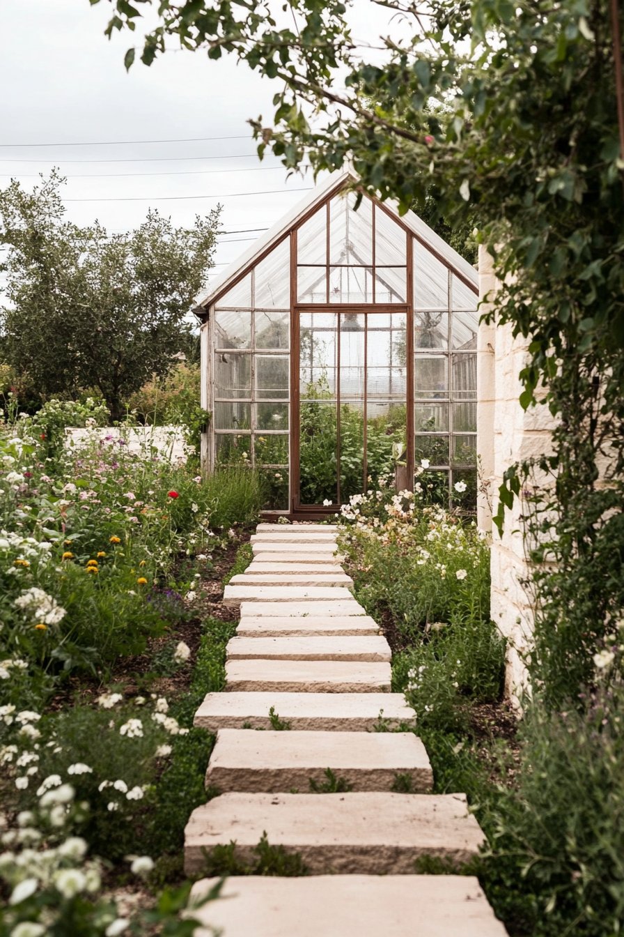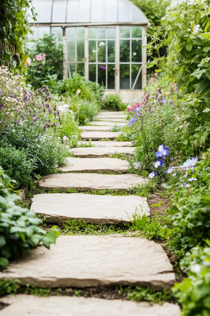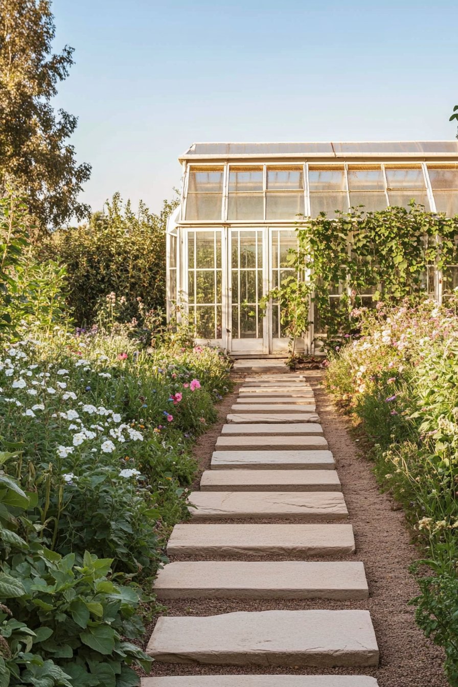 This design features a charming stone pathway flanked by vibrant, lush flowers leading to a quaint greenhouse. To achieve a similar look, I recommend using natural stone for the pathway and selecting a mix of perennial flowers in soft pastel colors for a harmonious, inviting atmosphere.