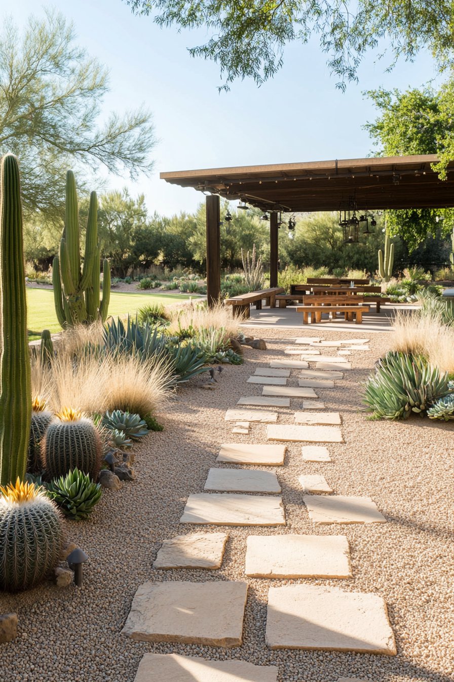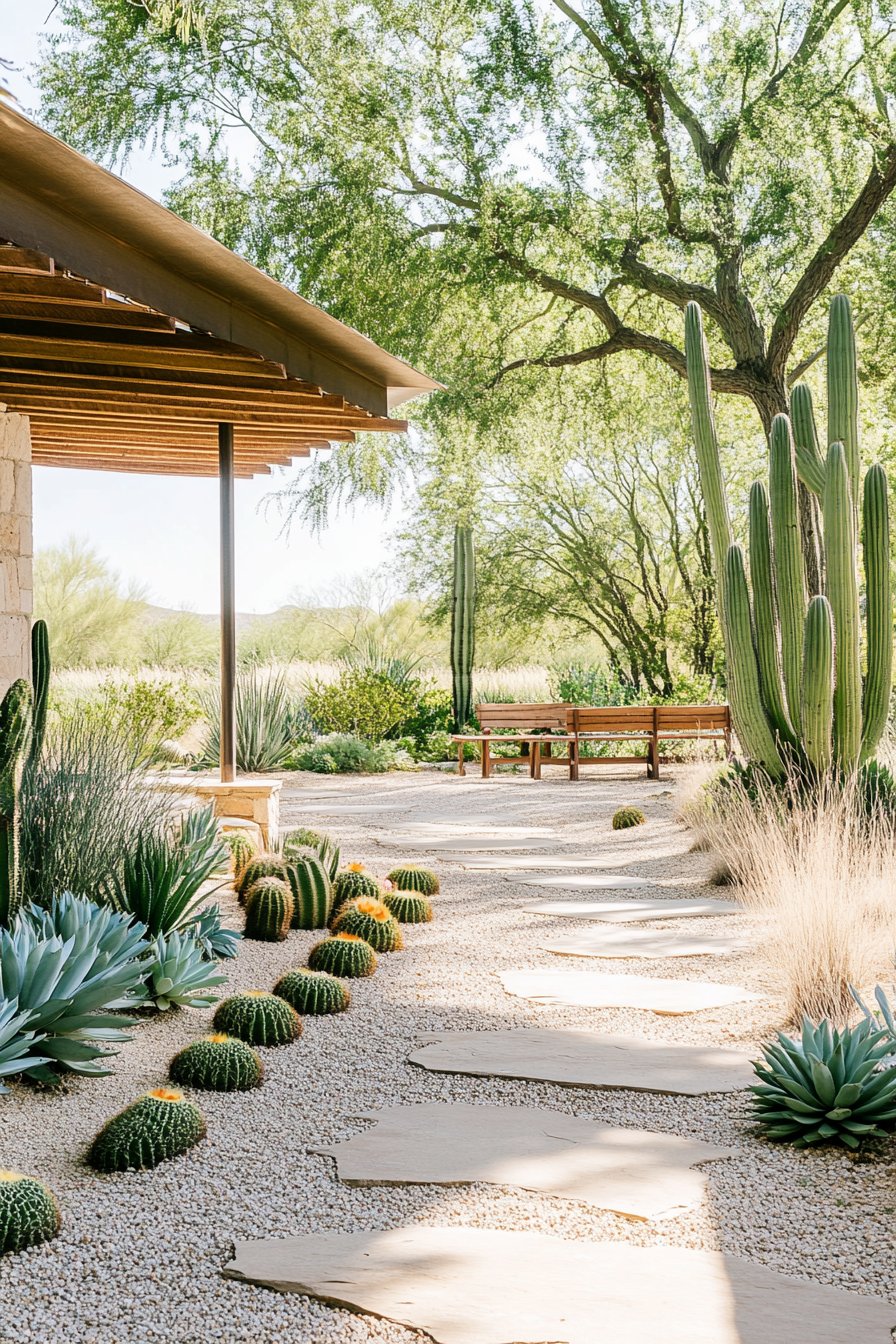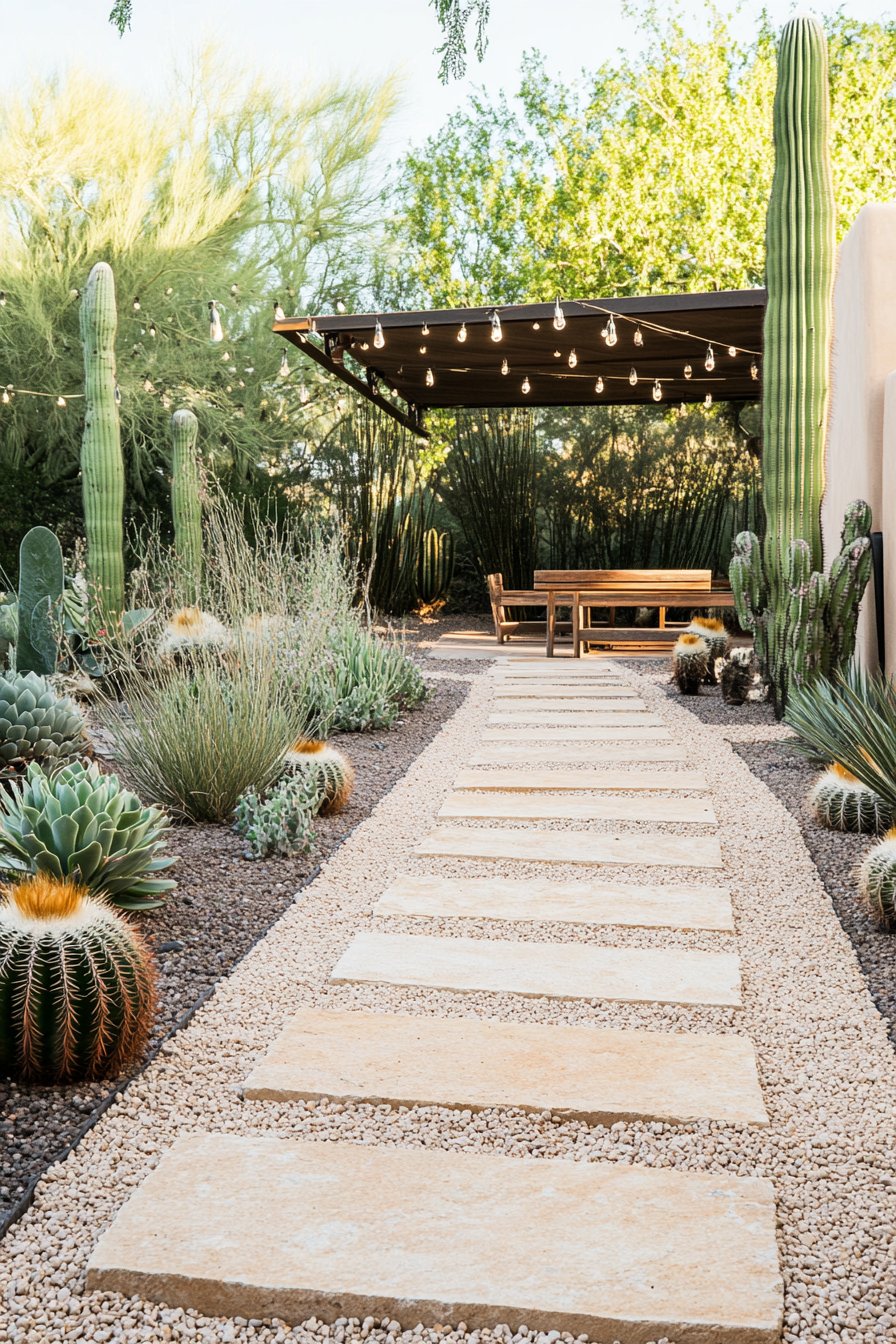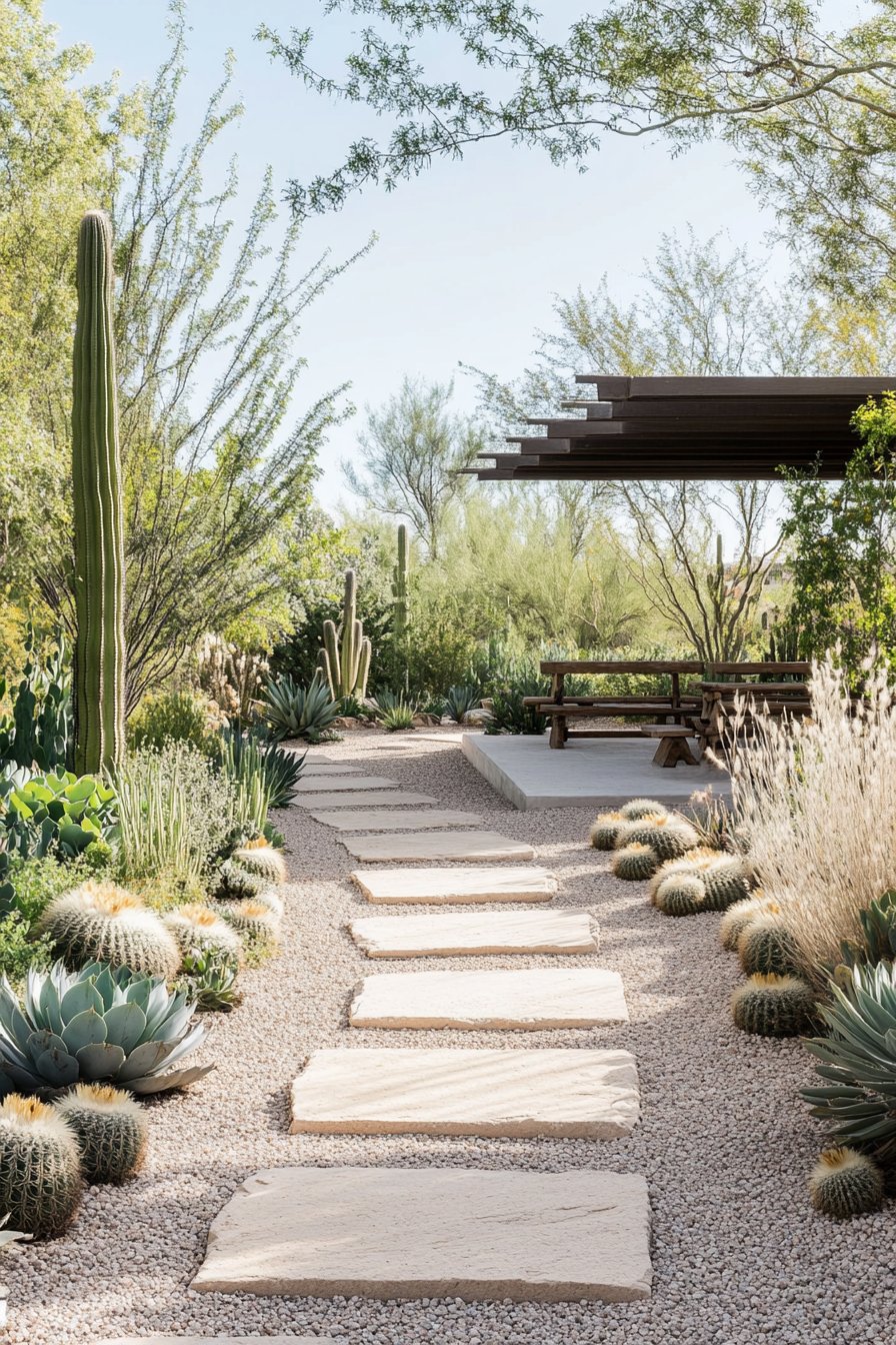 This design beautifully blends natural stone pathways with a variety of drought-resistant plants, creating a harmonious desert retreat. To achieve a similar look, I recommend using large, flat stones for walkways and incorporating native cacti and succulents for a low-maintenance, visually stunning landscape.