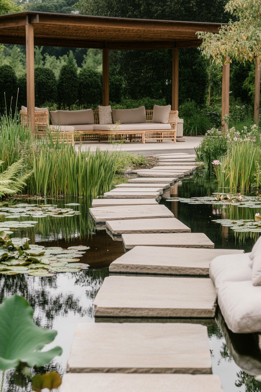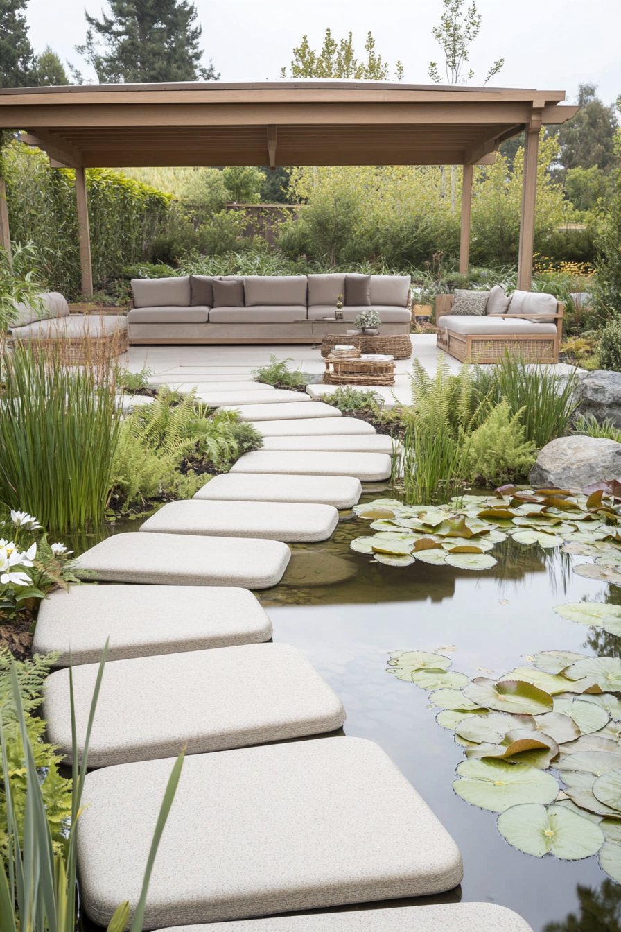 This garden design beautifully blends natural elements with modern comfort. To achieve a similar look, I recommend incorporating soft, neutral seating paired with lush greenery and a serene water feature, along with stepping stones that guide the eye through the space.