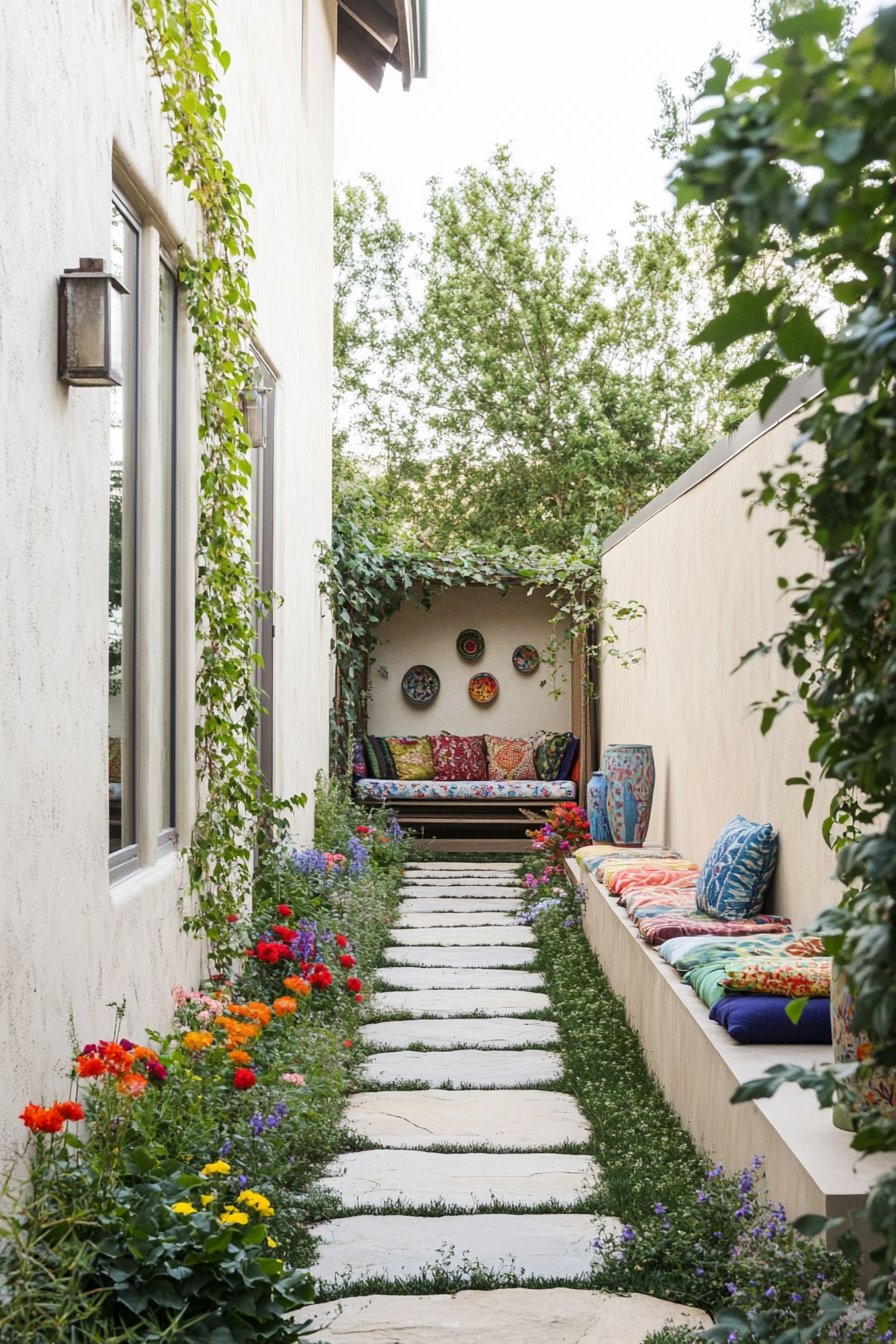 This design features a charming pathway lined with vibrant flowers and inviting seating areas, creating a delightful escape. To achieve a similar look, I recommend incorporating a mix of colorful cushions and lush greenery alongside natural stone pathways.