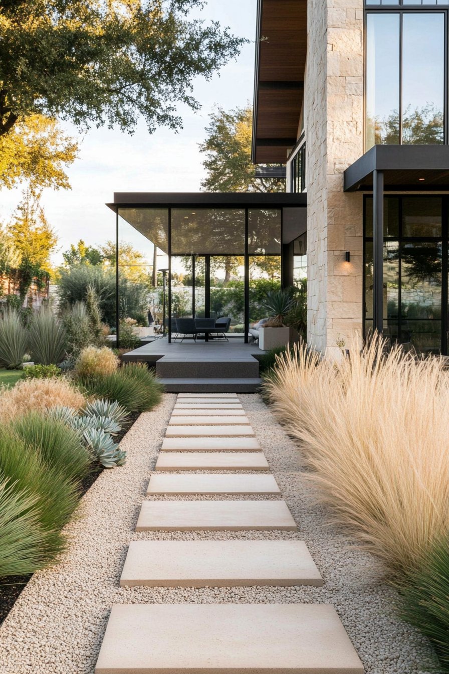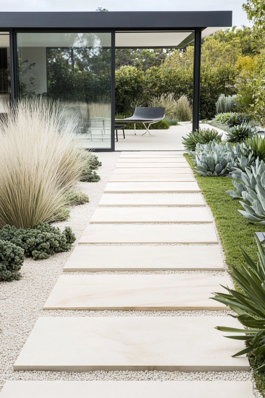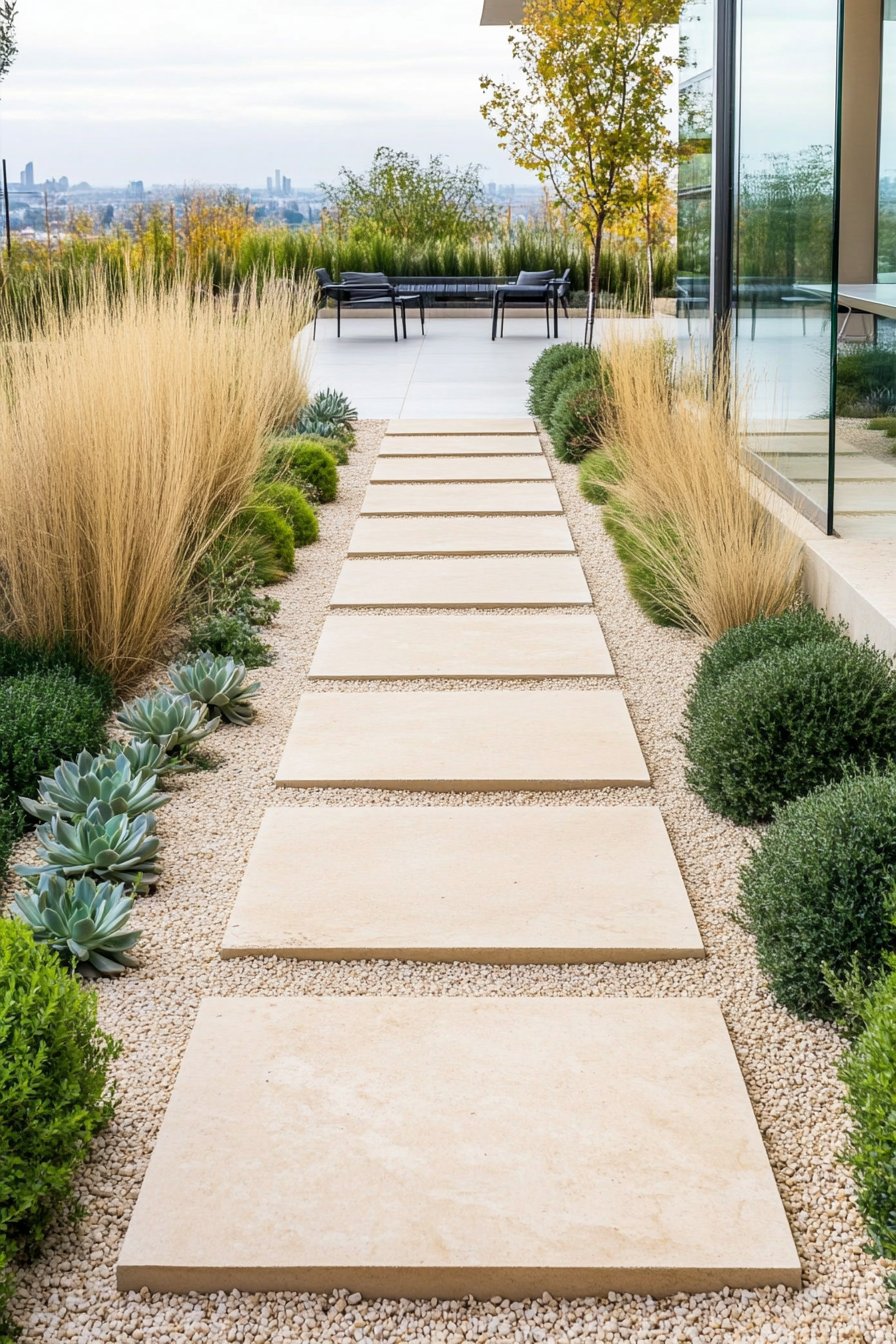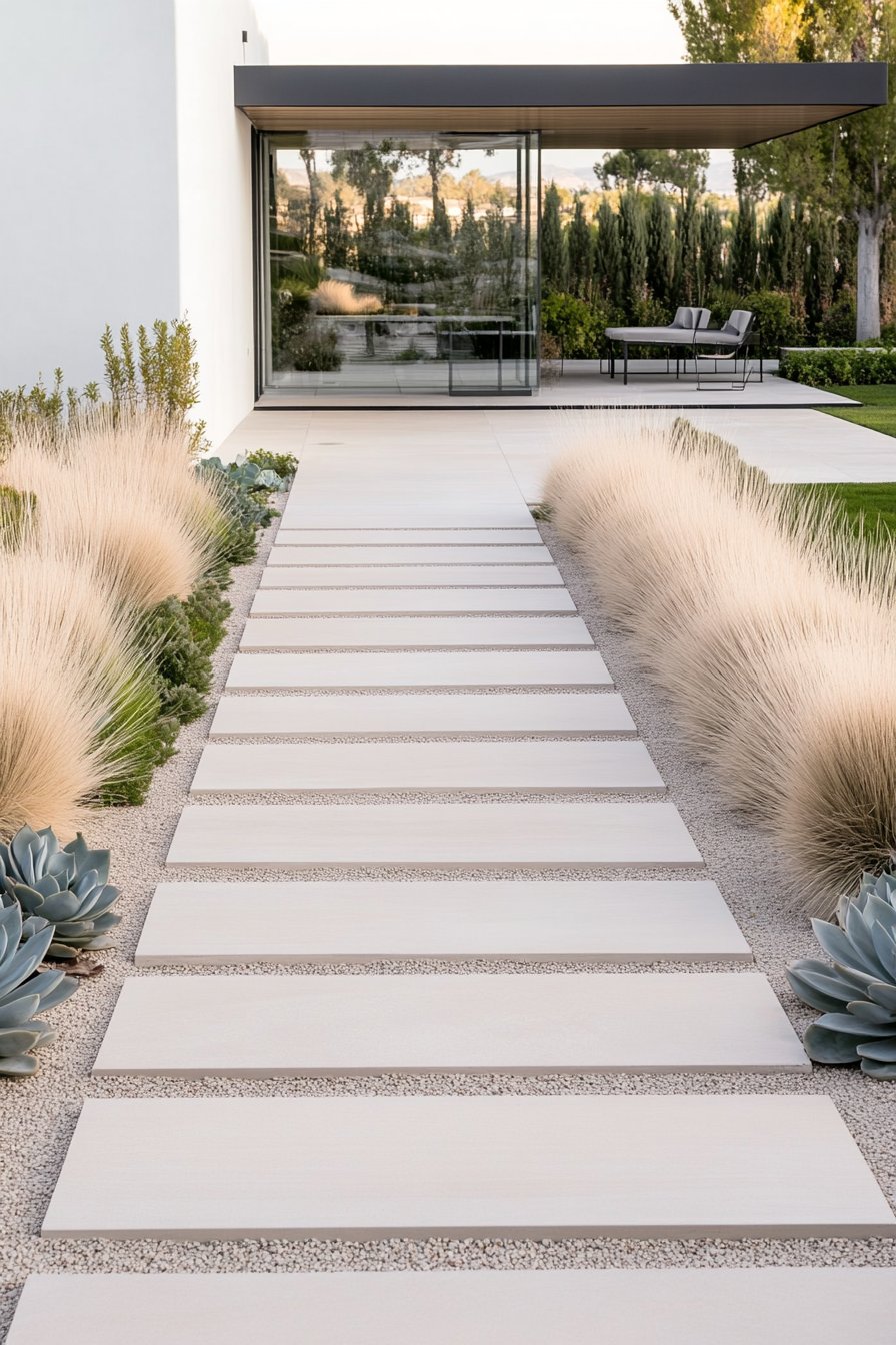 This design features a sleek pathway bordered by lush, textured grasses and succulents, creating a serene and inviting atmosphere. To achieve a similar look, I recommend using large, flat stepping stones and incorporating a mix of ornamental grasses and for a contemporary feel.