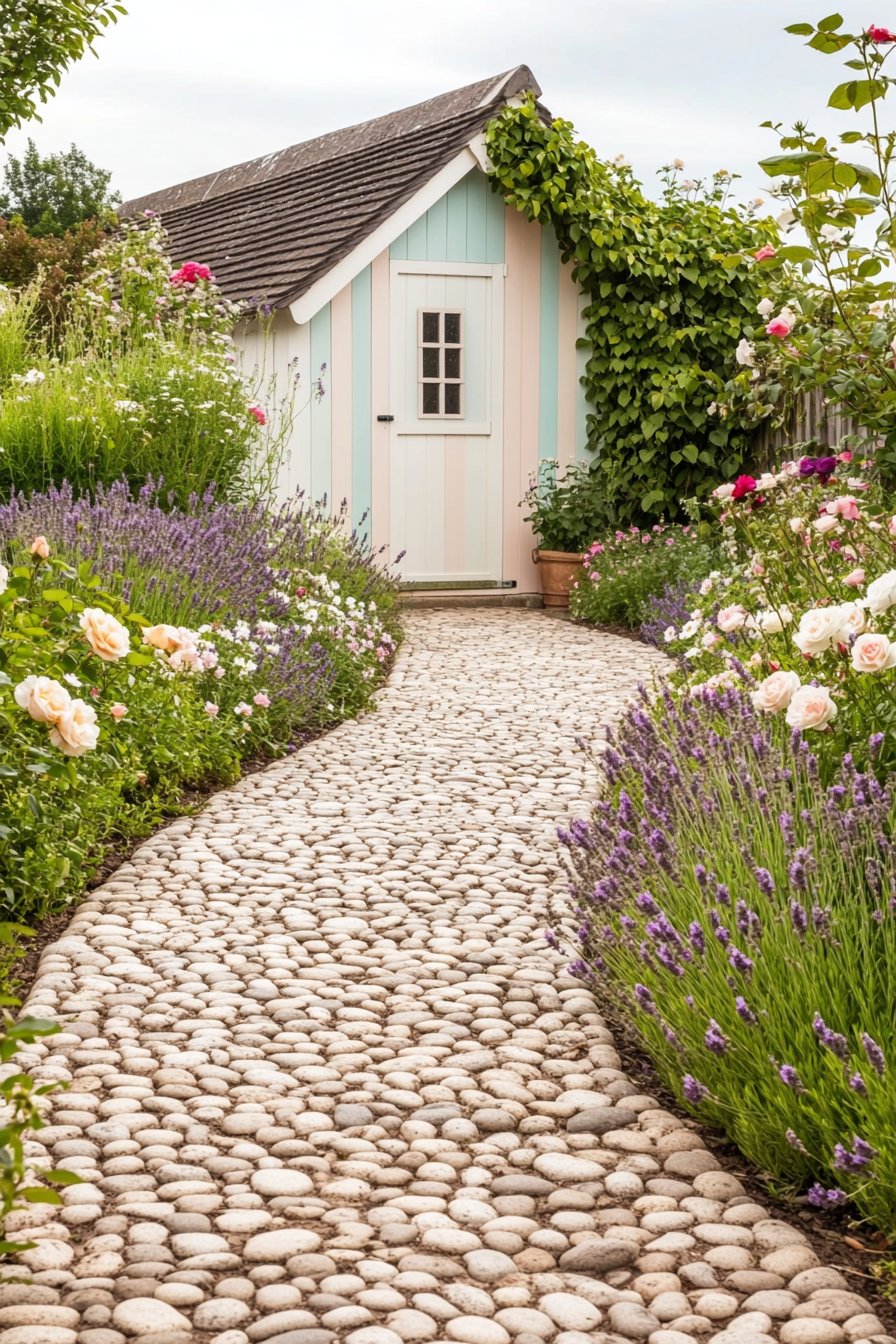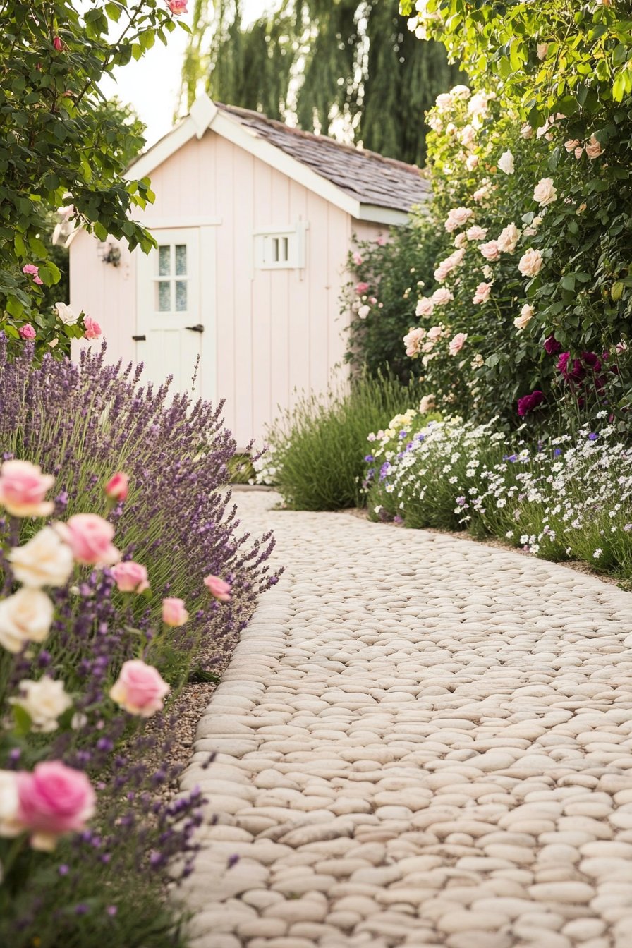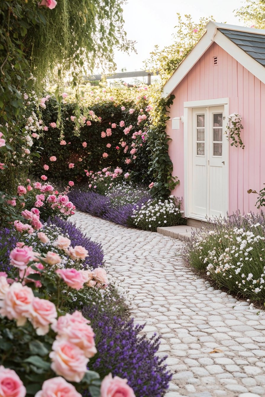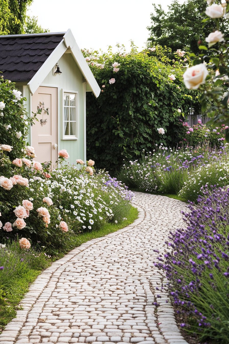This design features a delightful blend of pastel pink roses, vibrant lavender, and delicate , creating a serene and inviting atmosphere. To achieve a similar look, I recommend using cobblestone pathways to guide visitors through lush plantings, and incorporating a charming garden shed painted in soft hues to enhance the overall aesthetic.