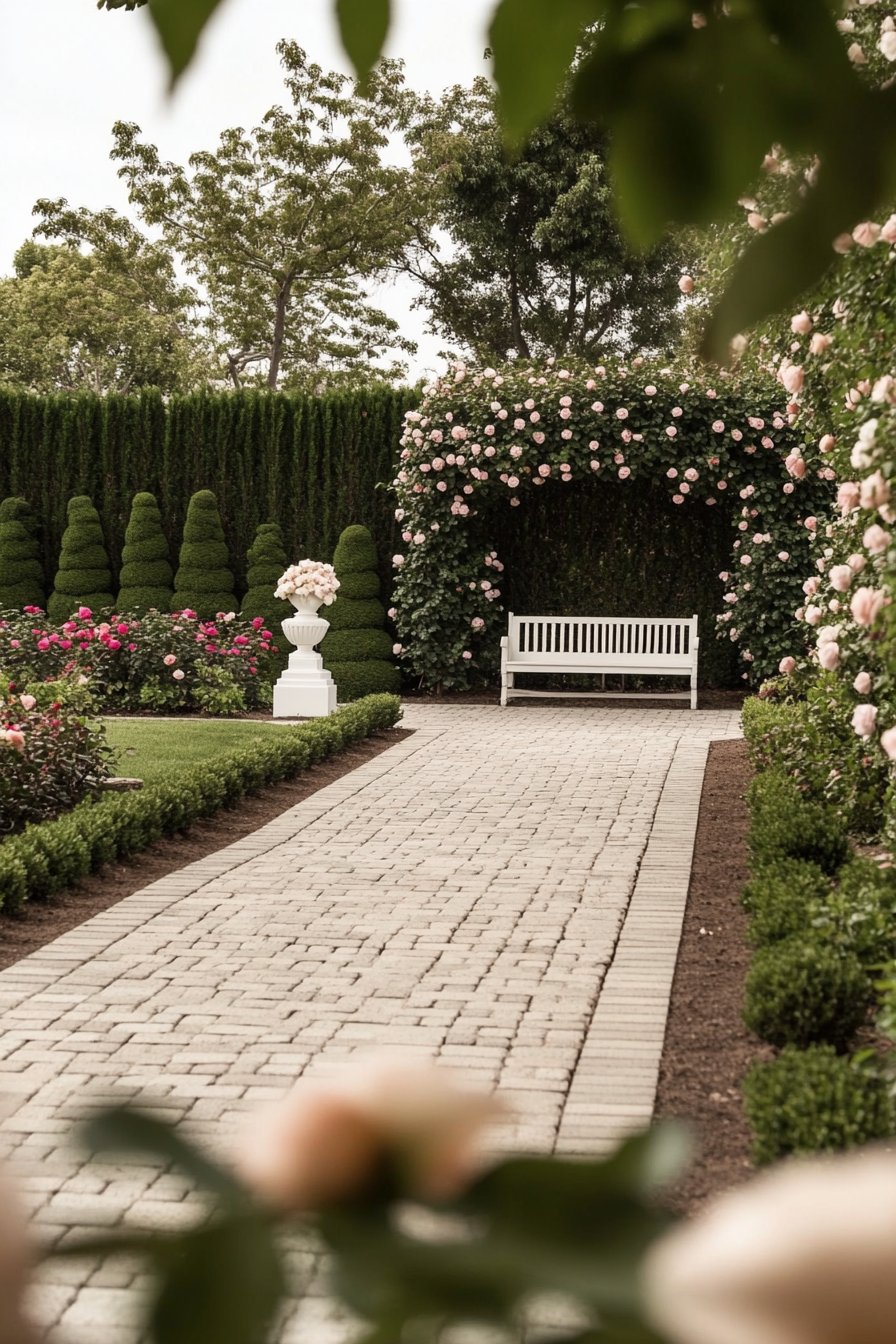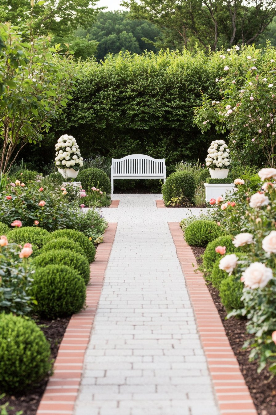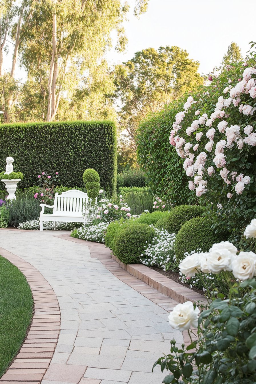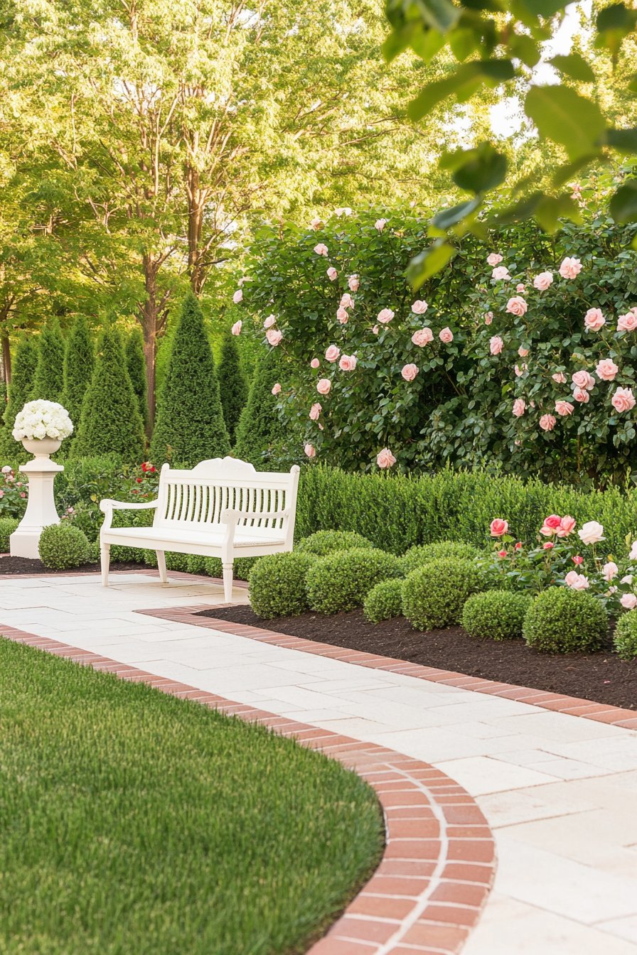 This garden design beautifully combines lush greenery with vibrant roses, creating a serene and inviting space. To achieve a similar look, I recommend incorporating neatly trimmed boxwoods and a classic white bench as focal points, complemented by a winding pathway to enhance the flow of the garden.