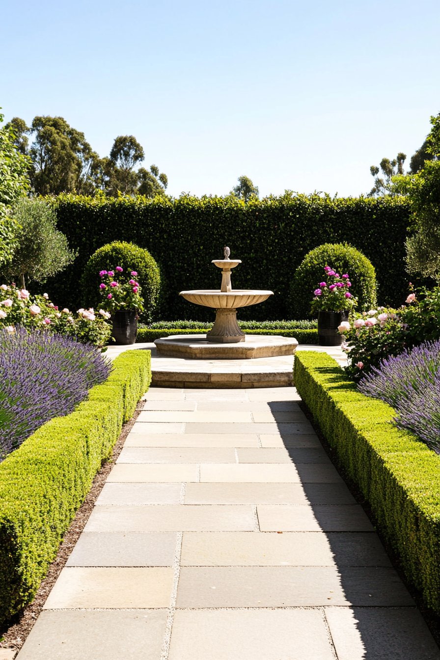 This garden design features a stunning stone pathway leading to a beautifully crafted fountain, surrounded by lush lavender and neatly trimmed hedges. To achieve a similar look, I recommend using natural stone for pathways and incorporating fragrant plants like lavender to create a serene atmosphere.