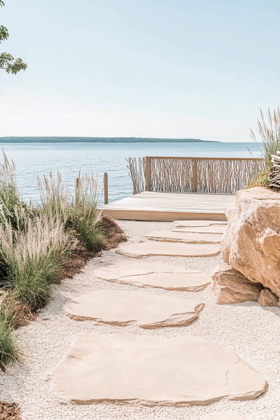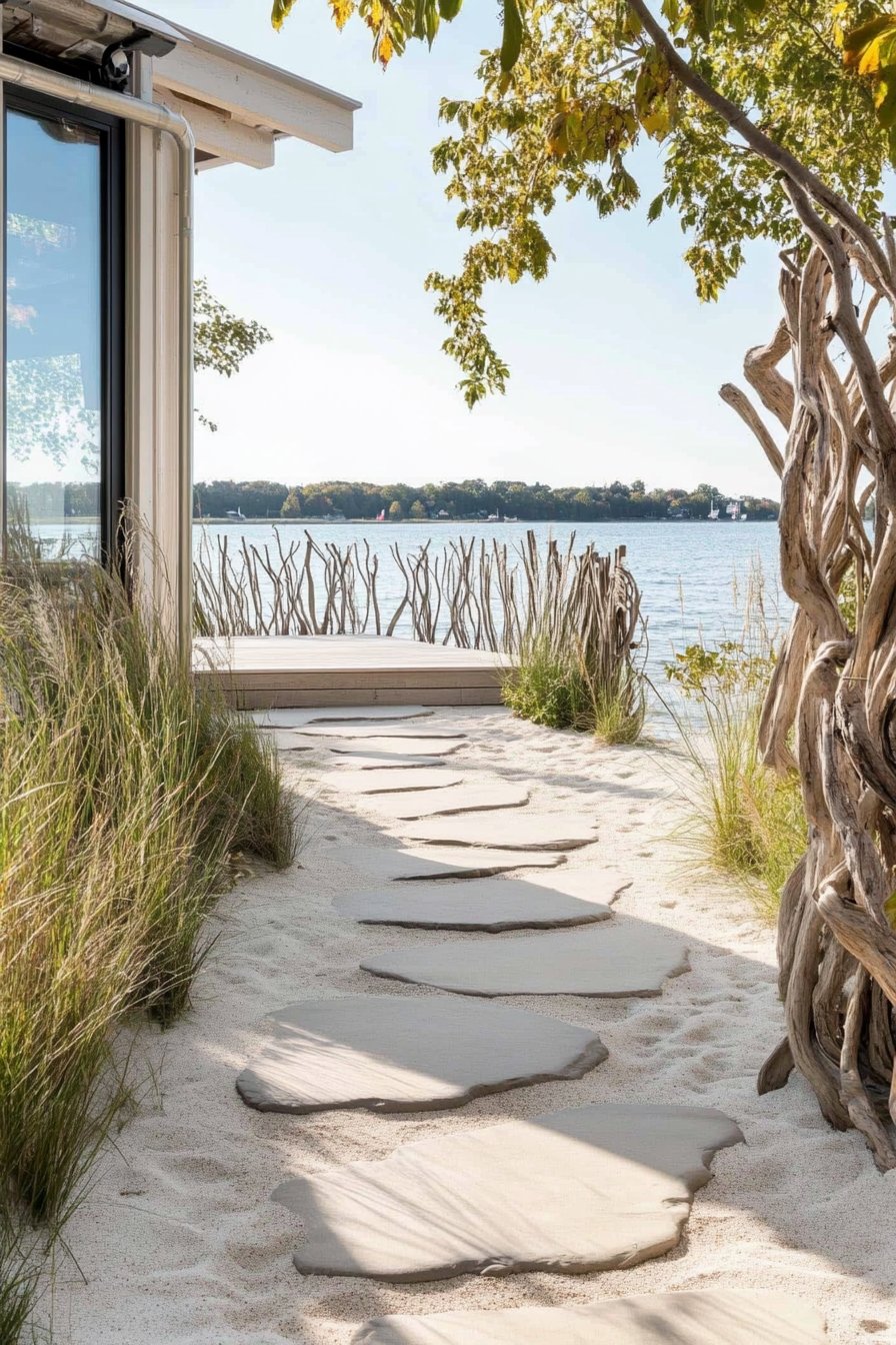 This design features a tranquil pathway lined with soft, sandy textures and natural elements. To achieve a similar look, I recommend using large stone pavers to create a winding path, complemented by ornamental grasses and driftwood accents for a coastal vibe.