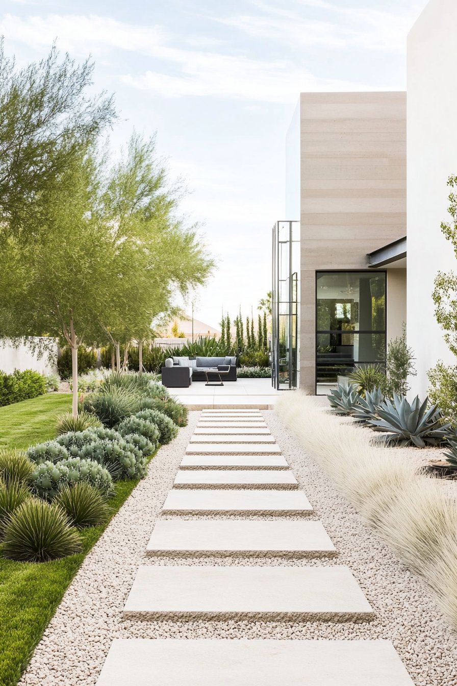 This design beautifully integrates a modern desert aesthetic with vibrant greenery and structured pathways. To achieve a similar look, I recommend using a mix of drought-resistant plants and clean, geometric stone pathways to create an inviting space that balances nature and contemporary design.