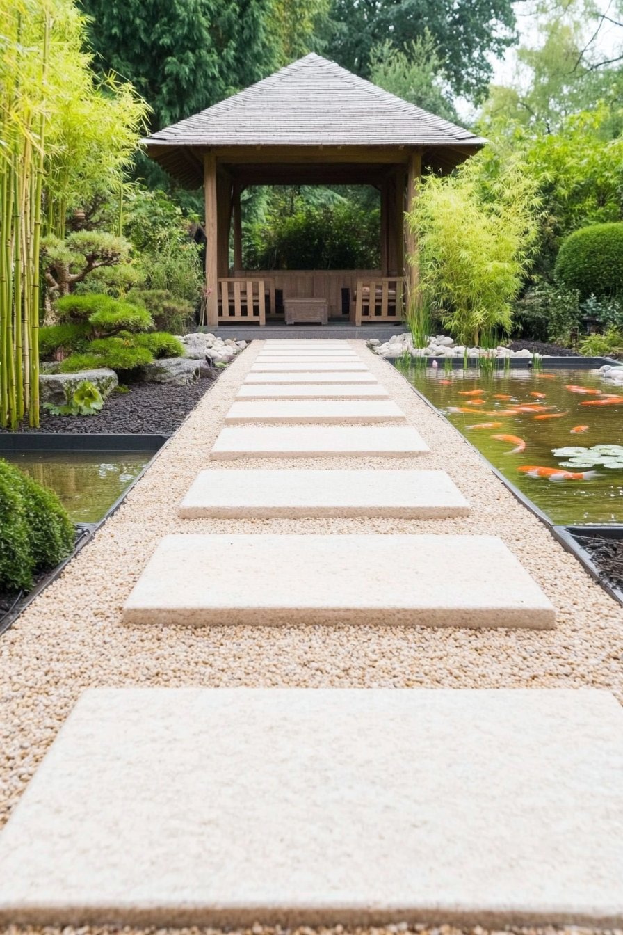 This design beautifully combines natural elements with clean lines, creating a tranquil outdoor space. To achieve this look, I recommend using large stone pavers set in a gravel bed, surrounded by a mix of ornamental grasses and succulents for added texture and color.