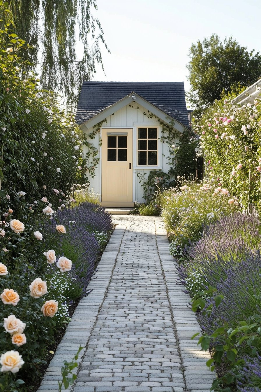 To achieve a similar look, I recommend planting fragrant lavender alongside pastel-colored roses, and using cobblestones for a rustic yet elegant pathway. Incorporating a cozy garden shed adds a charming focal point that enhances the overall aesthetic.