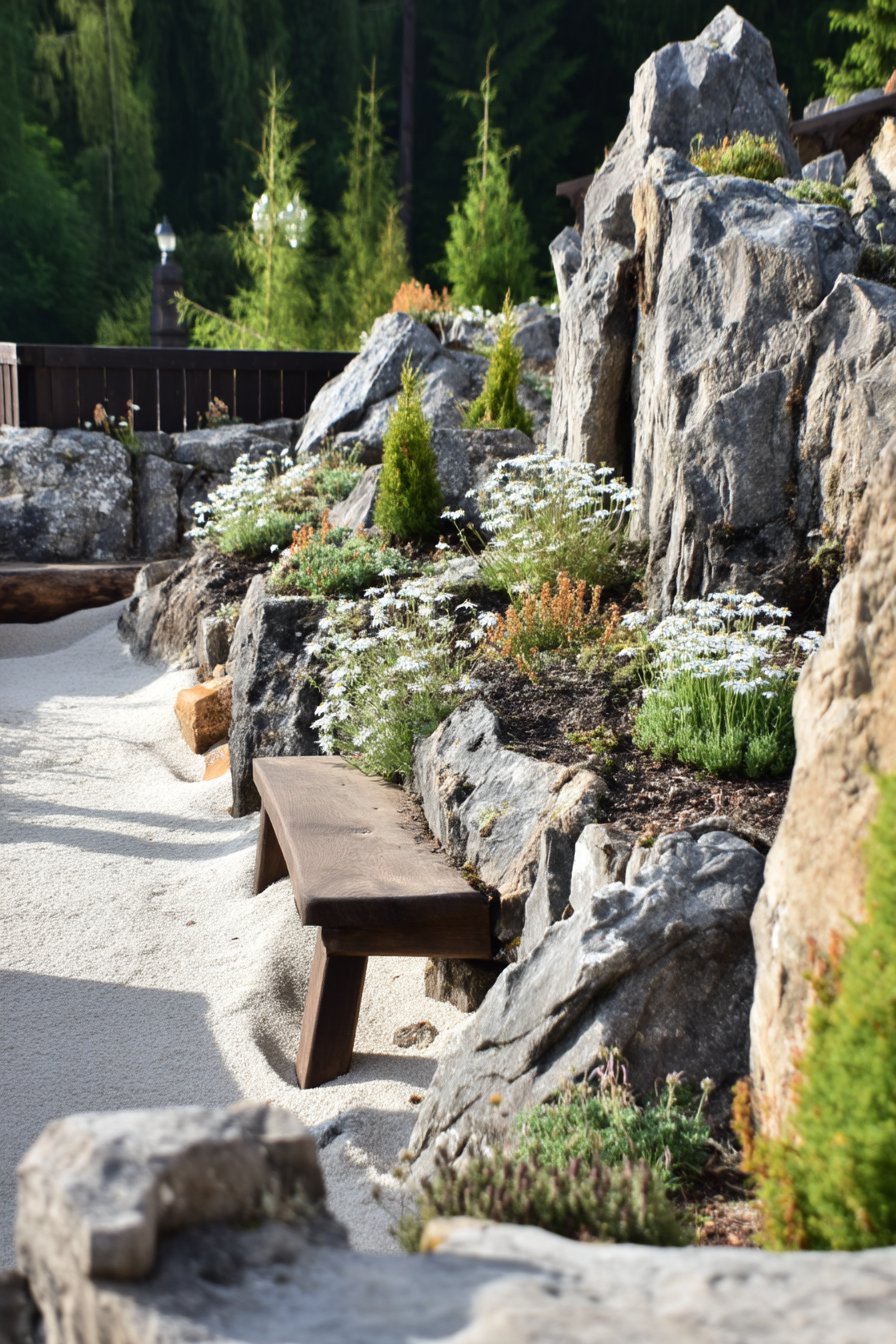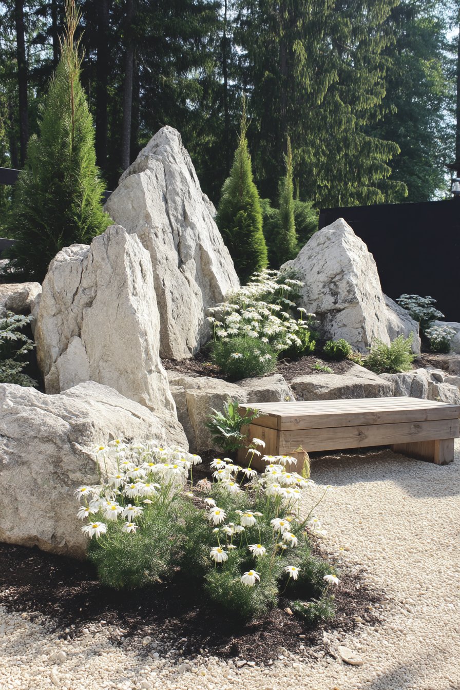 This design harmoniously blends rugged stones with vibrant white daisies, creating a serene and inviting atmosphere perfect for relaxation. To replicate this look, incorporate low-maintenance perennials like daisies alongside natural stone features and a simple wooden bench for seating.
