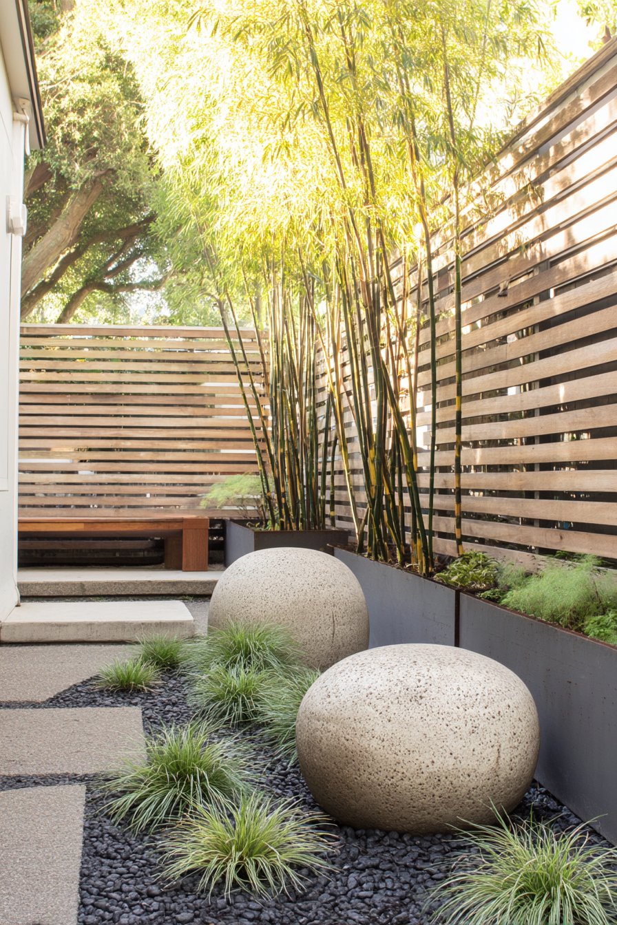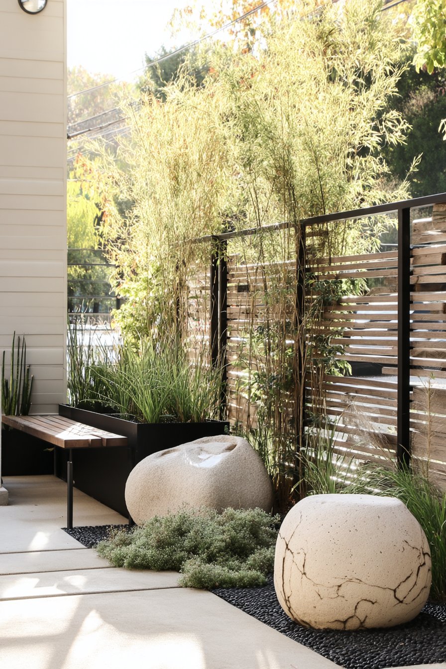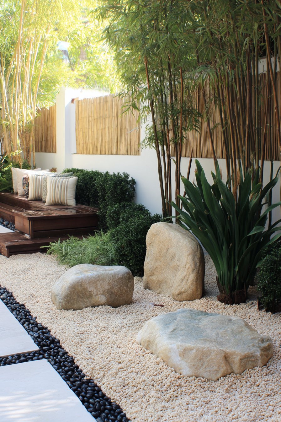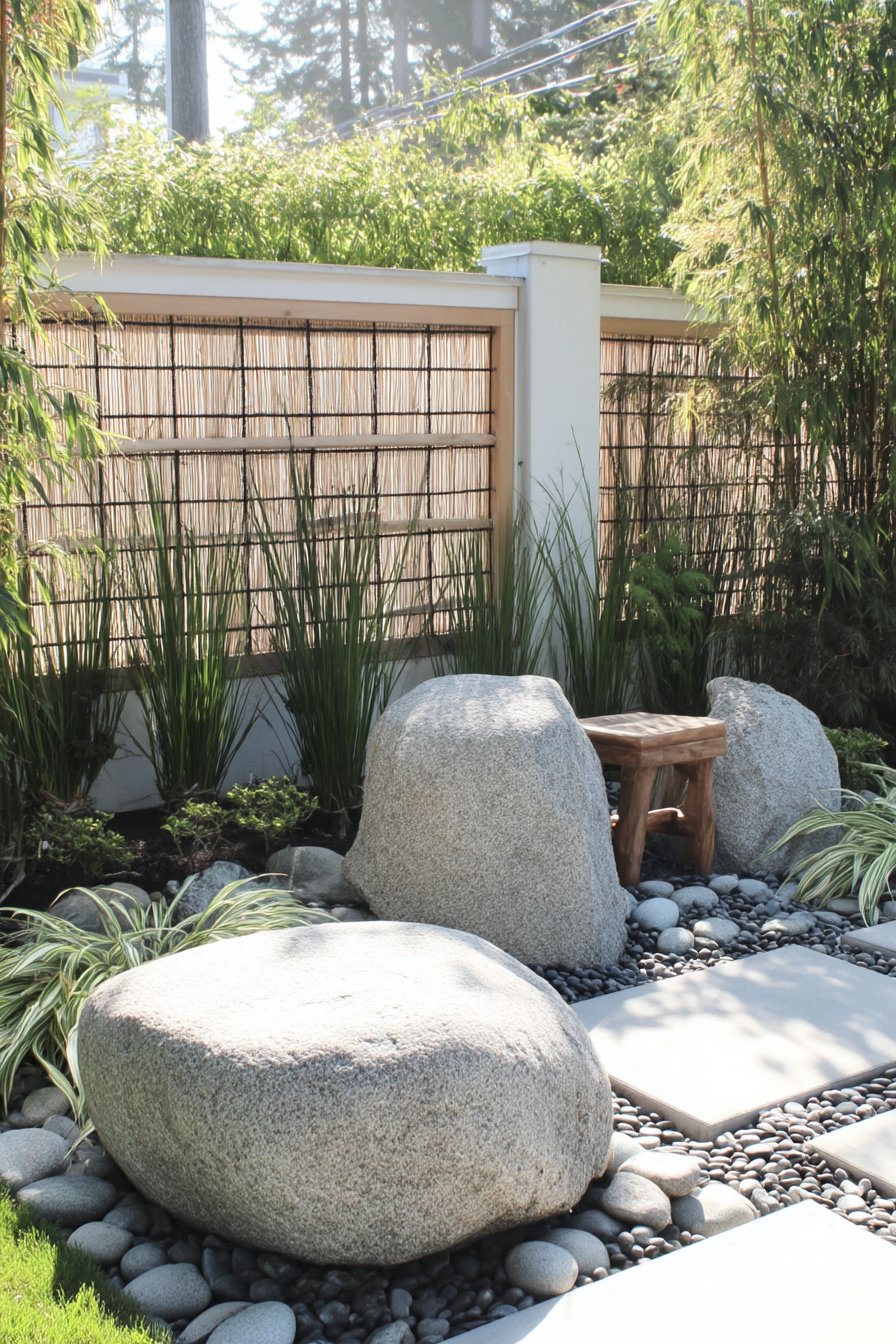 This serene garden features elegant bamboo and striking boulders, creating a tranquil atmosphere perfect for relaxation. To achieve a similar look, incorporate low-maintenance grasses and natural stone elements for an inviting, modern aesthetic.