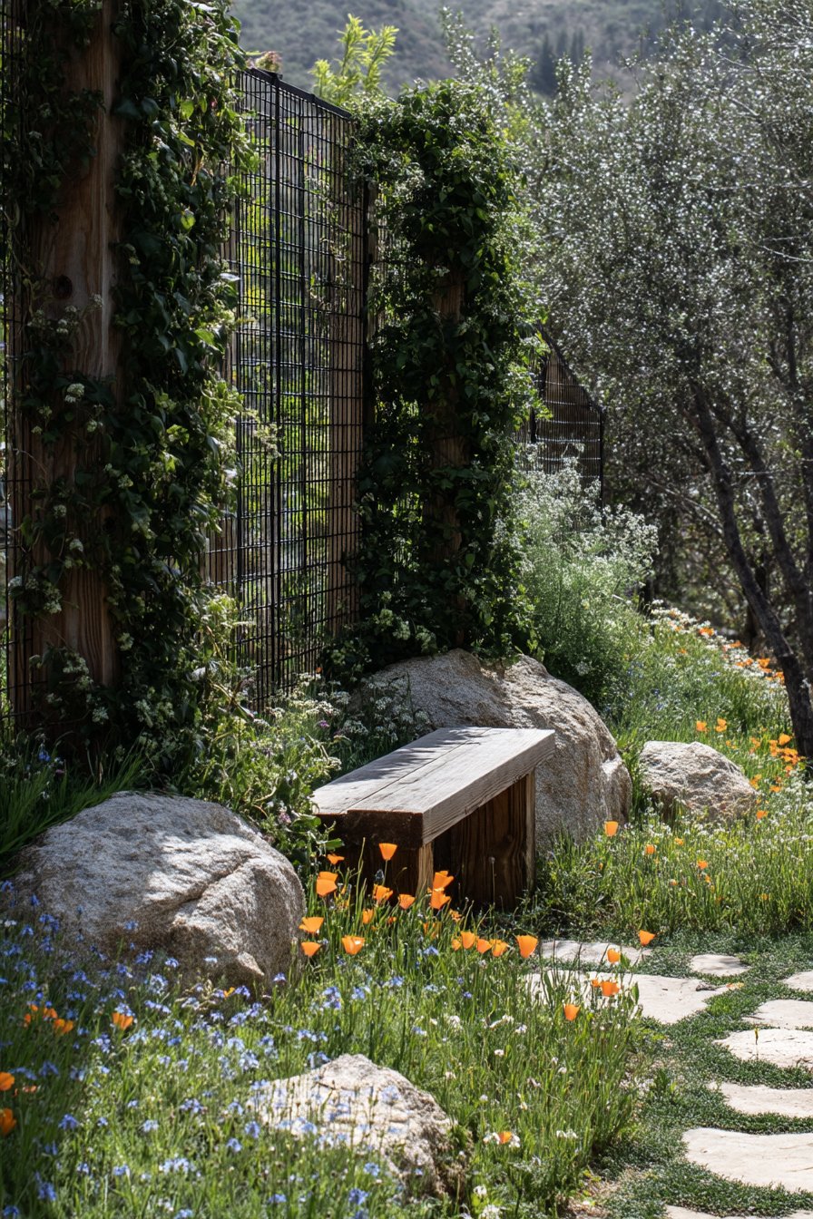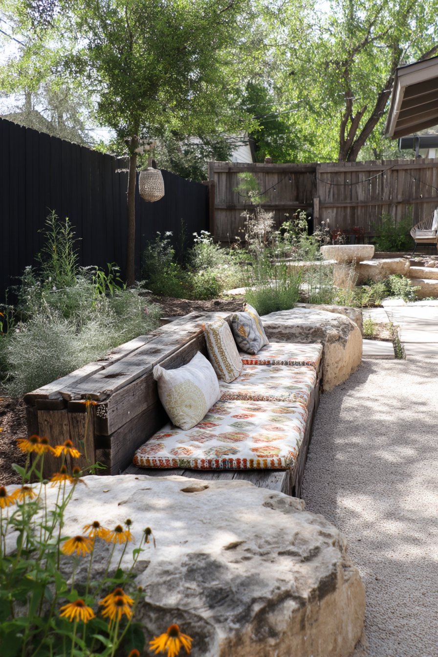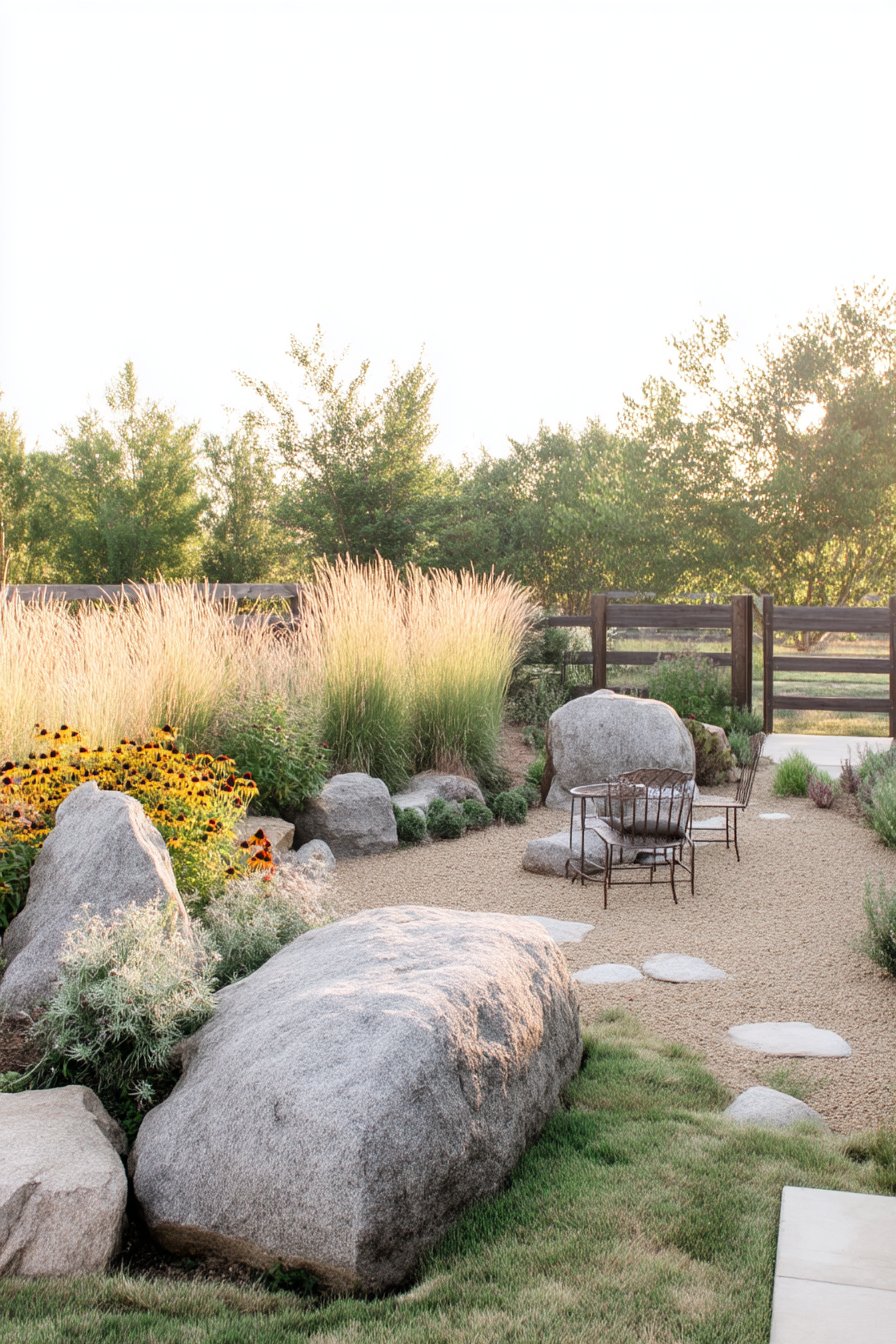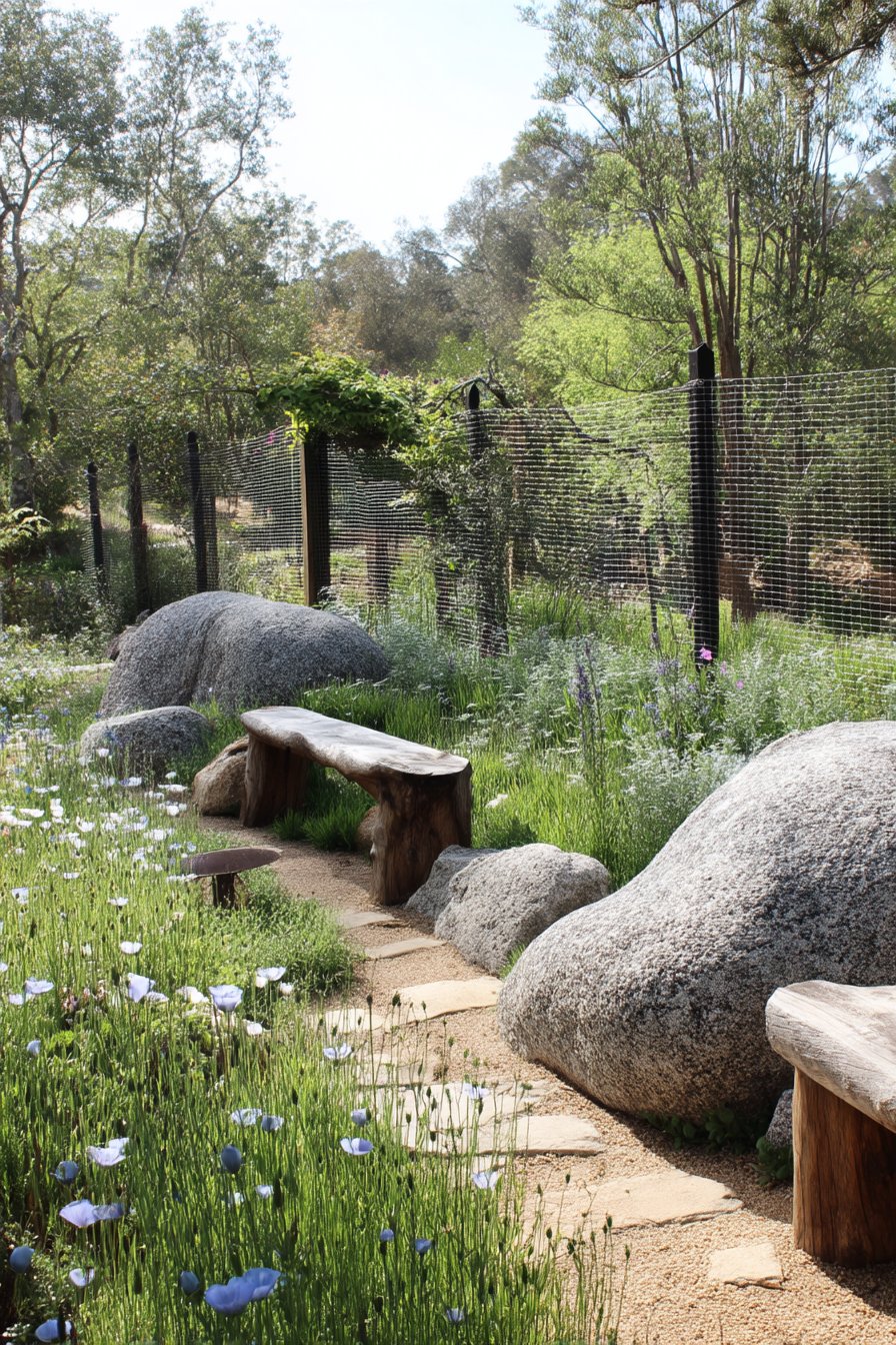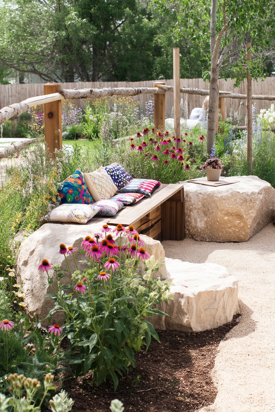 The rustic boulder seating harmonizes beautifully with vibrant wildflowers like black-eyed Susans and delicate grasses, creating a natural and inviting atmosphere. To replicate this look, consider using reclaimed materials for seating and incorporating for low-maintenance charm.
