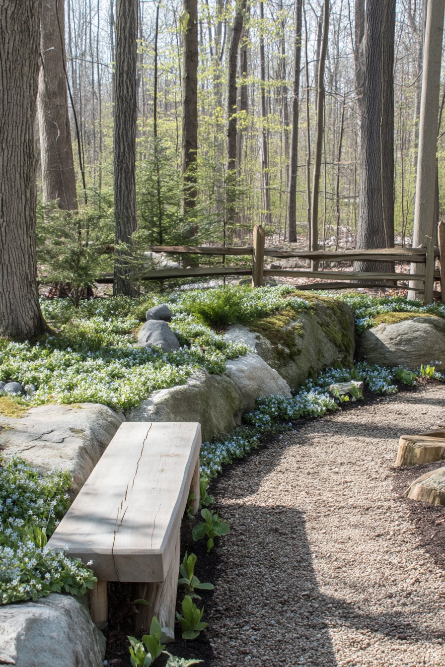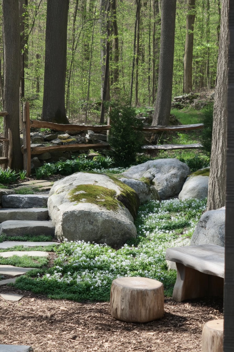 A harmonious blend of moss-covered boulders and delicate, white flowering ground cover creates a tranquil retreat, inviting relaxation amidst nature. To achieve this look, incorporate native plants and natural stone pathways to enhance the woodland feel.
