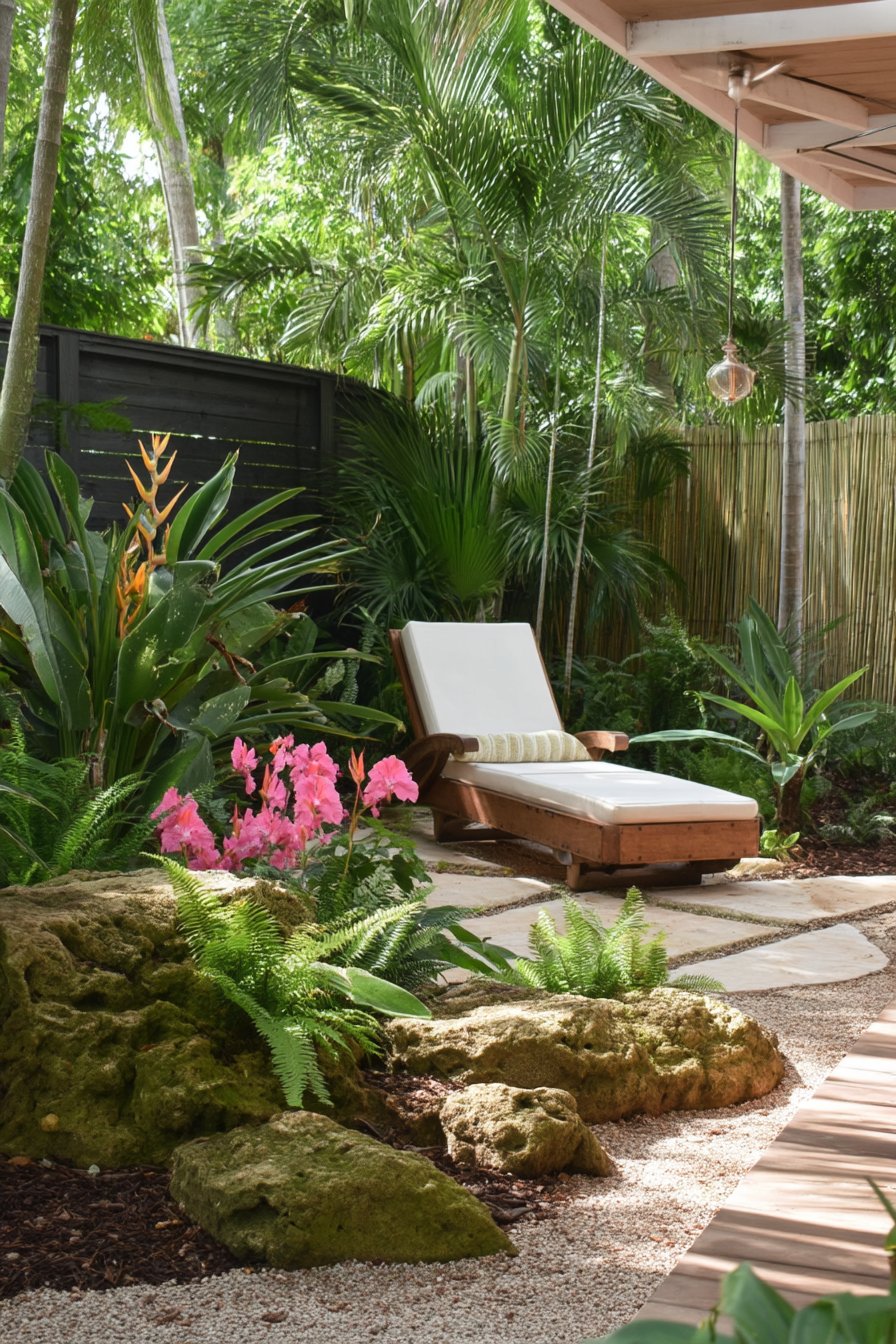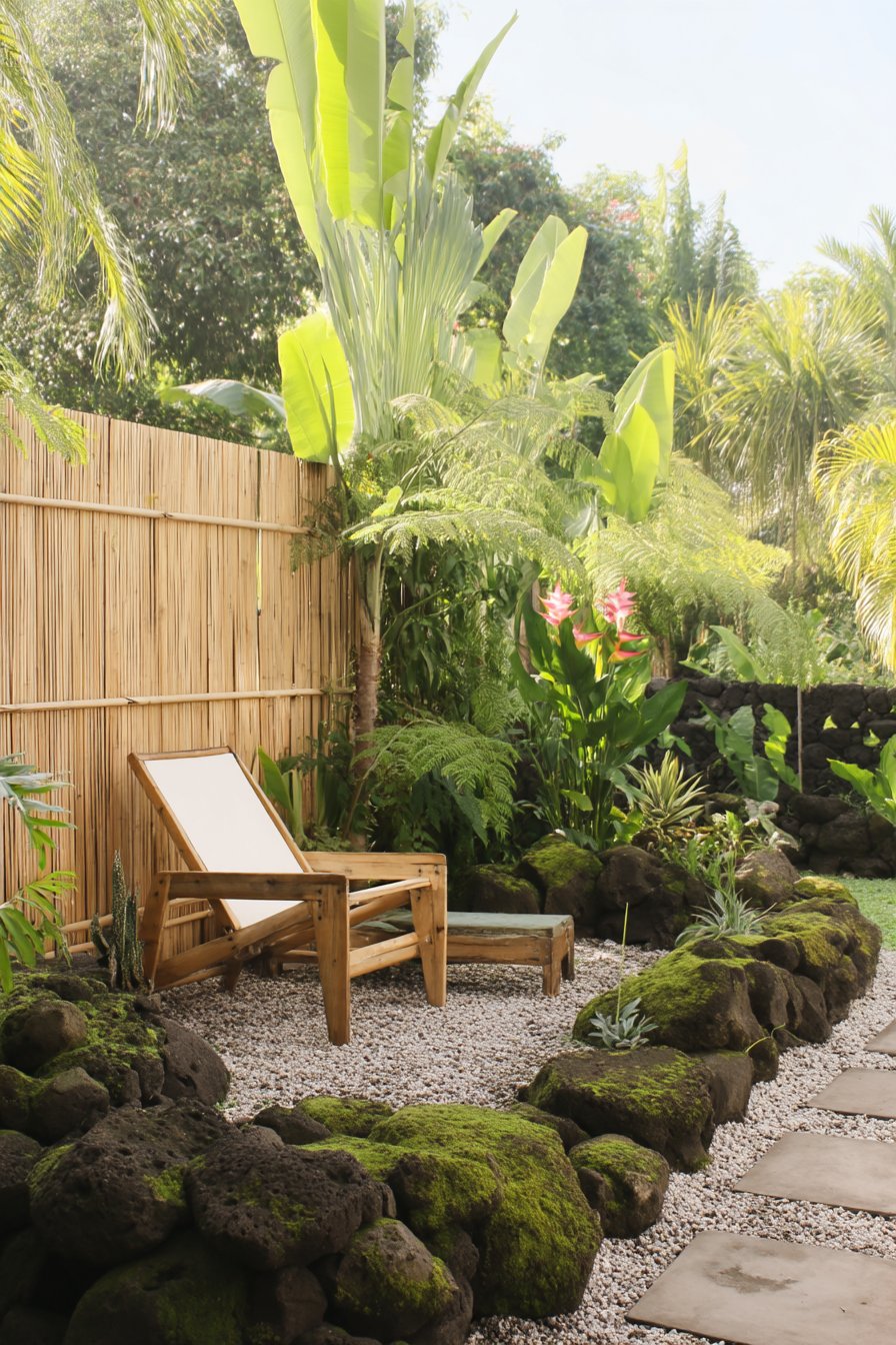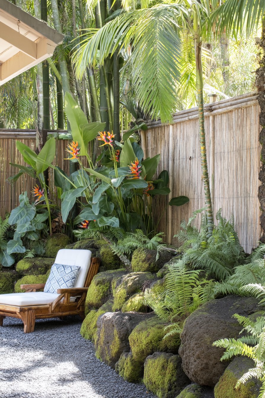 Lush tropical foliage, including towering banana plants and vibrant heliconias, creates a serene retreat, while lava boulders add texture and contrast. To achieve a similar oasis, incorporate varied foliage heights and a mix of gravel and stone for pathways.