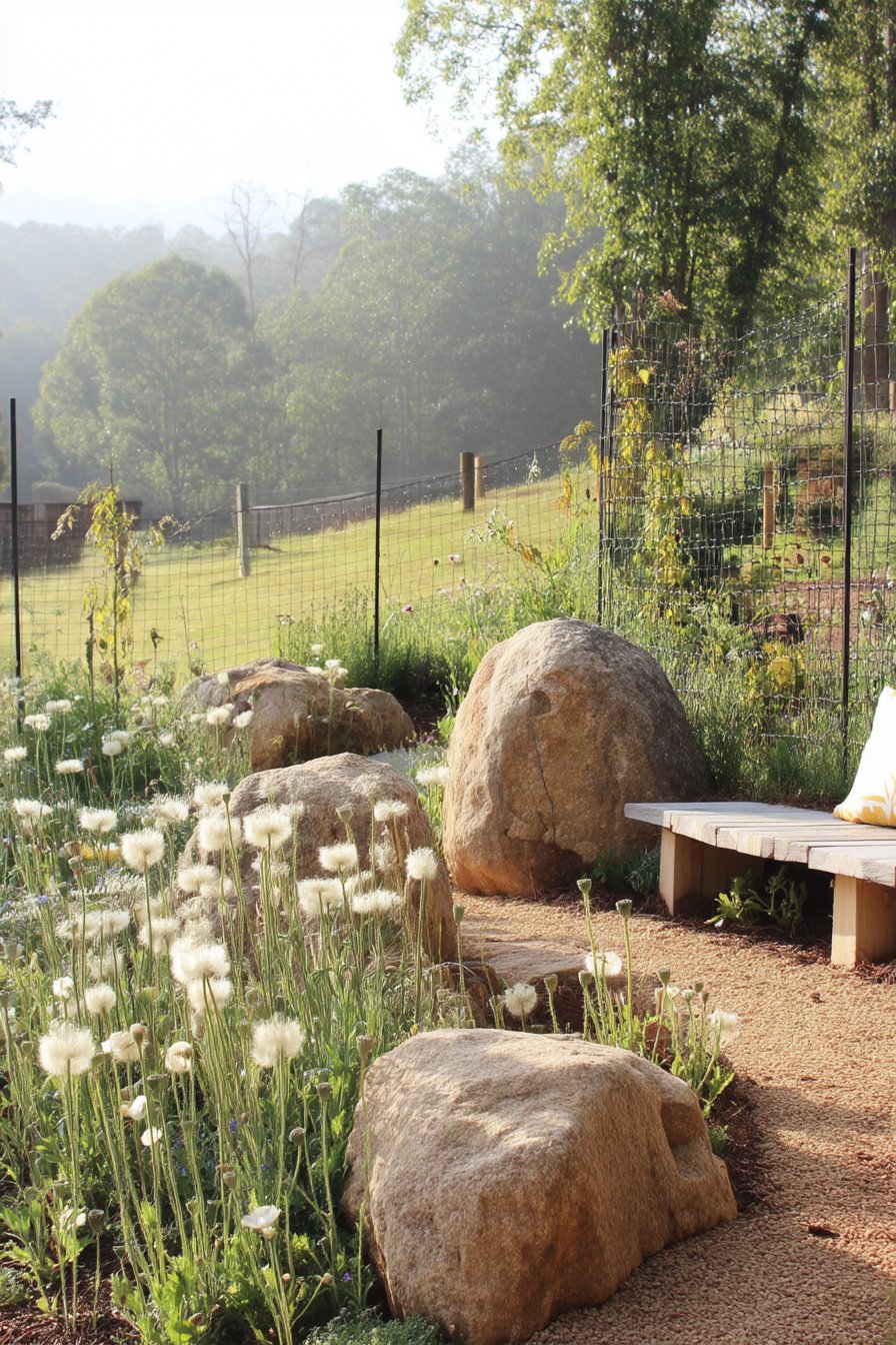 This design beautifully combines natural boulders with wild dandelions and delicate wildflowers, creating a serene and organic atmosphere. To replicate this look, incorporate hardy native plants and strategically place stones to form inviting seating areas.