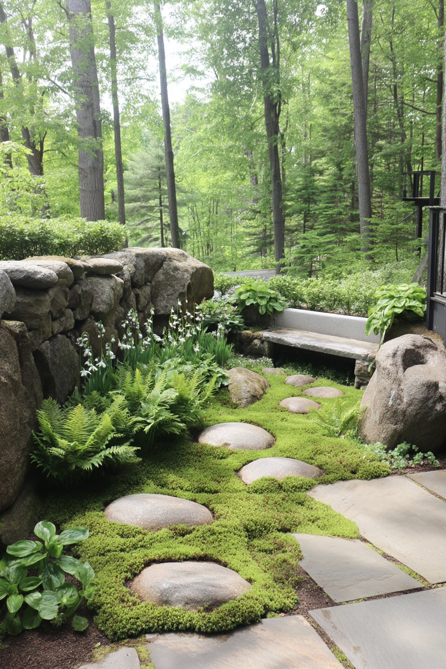 Create a tranquil retreat by incorporating lush ferns and delicate white flowers alongside smooth boulders, which add an organic touch. Use stepping stones nestled in vibrant moss for a charming pathway, inviting exploration and connection with nature.