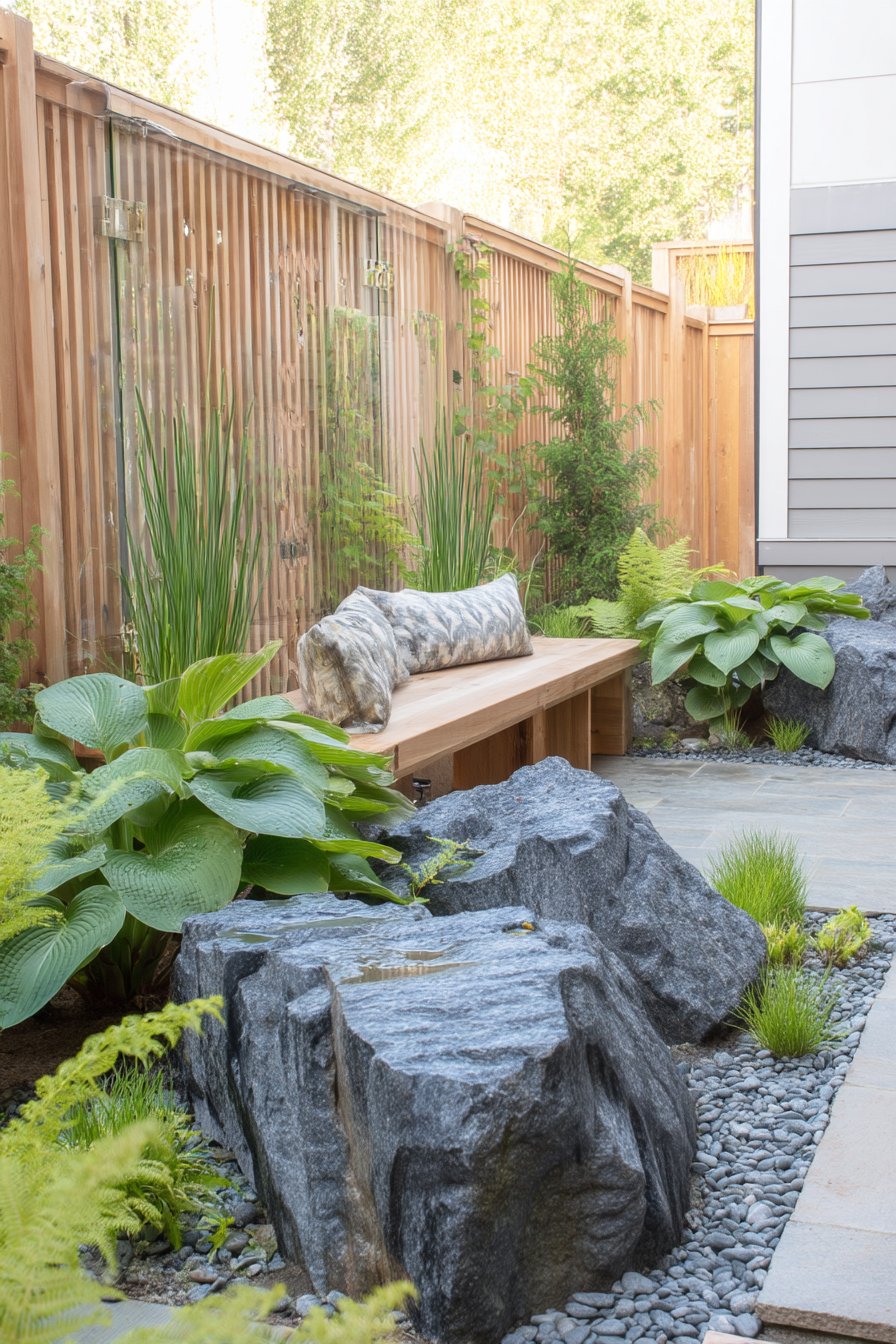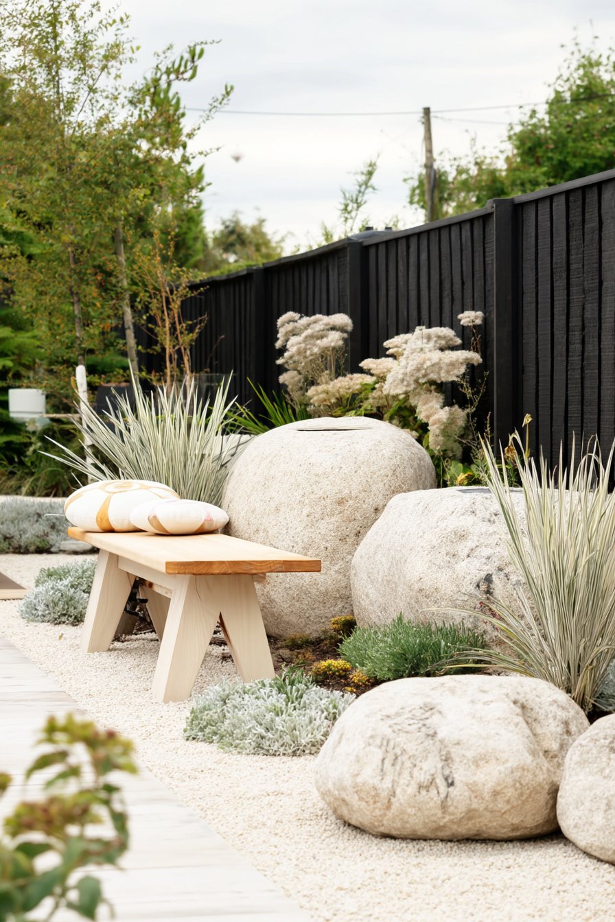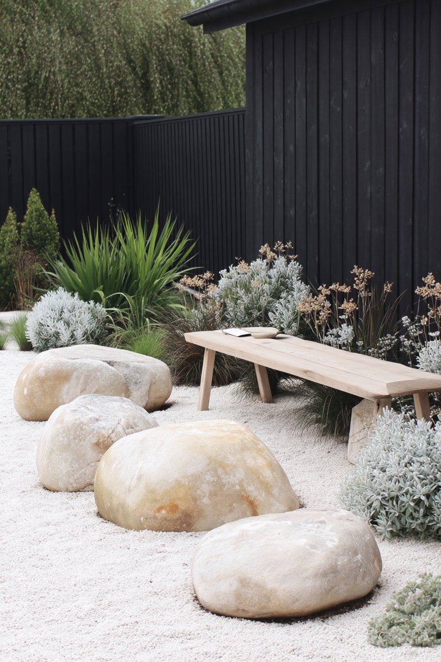 The sleek lines of the wooden bench complement the natural textures of the large stones, creating a harmonious and inviting space. Incorporate low-maintenance plants like ornamental grasses and succulents to achieve a modern, drought-tolerant garden aesthetic.