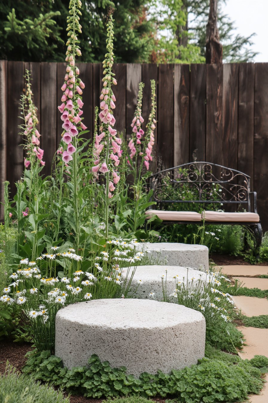 The enchanting combination of tall pink foxgloves and cheerful daisies creates a vibrant, inviting pathway that draws the eye and invites exploration. To replicate this look, consider planting these flowers alongside stepping stones, allowing ground cover to soften the edges for a rustic charm.